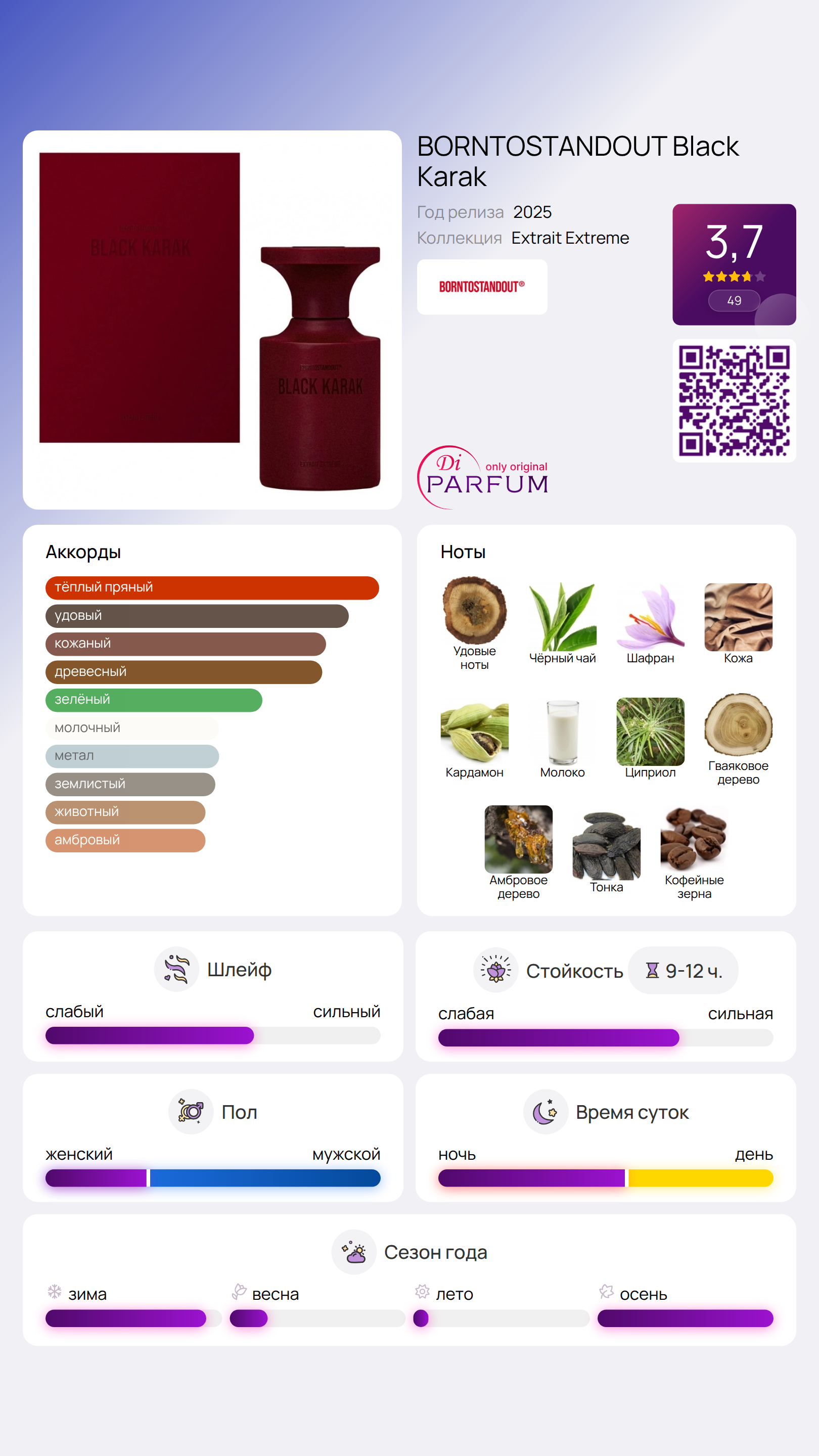 Дополняет композицию нота бобов тонка и кофе, придавая Black Karak уникальный шлейф, который оставляет след в памяти каждого, кто с ним столкнется. Этот аромат станет настоящим открытием для ценителей качественной парфюмерии, подчеркивая индивидуальность и стиль своего обладателя.
