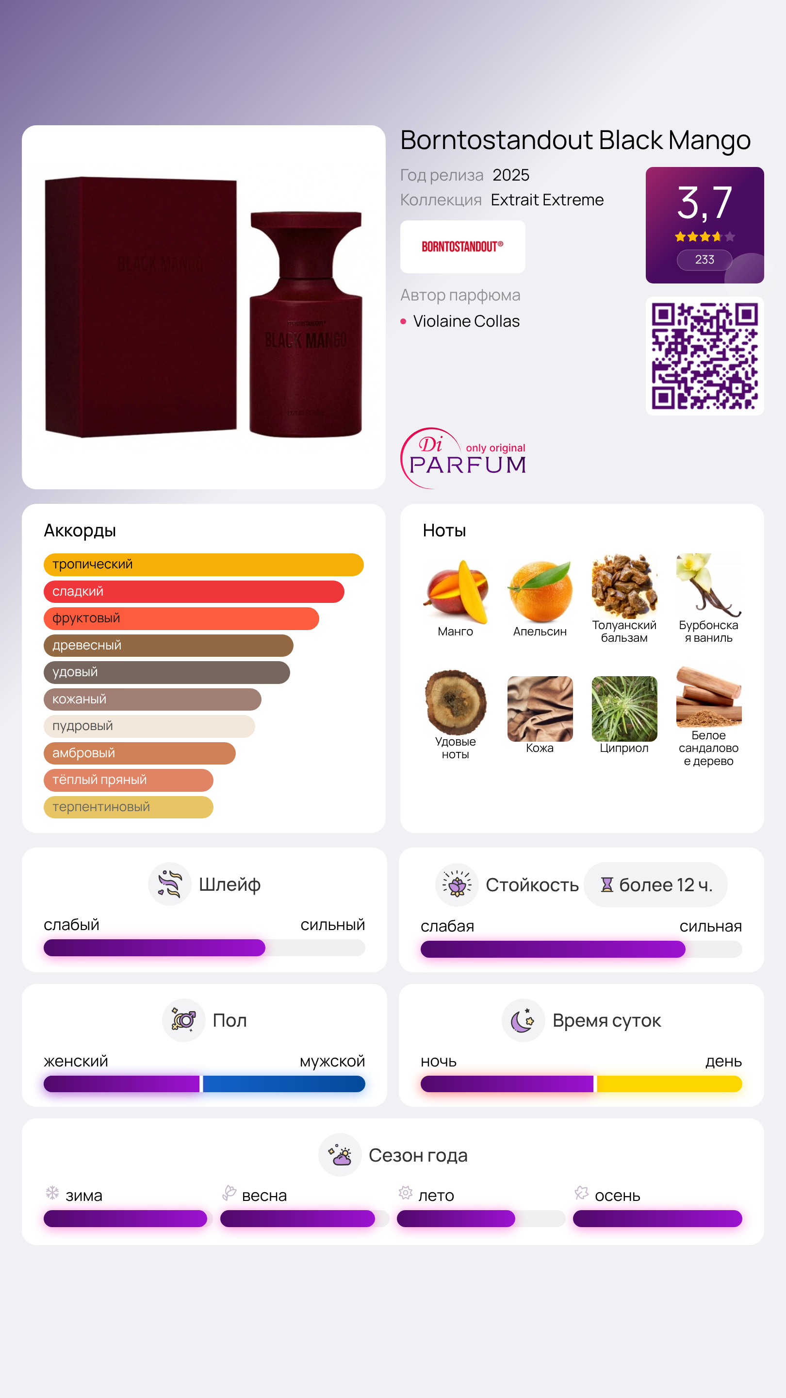 Завершает аромат гармония, в которой сочетаются кожаный аккорд, сандал и уд, создавая образ «фруктов, пропитанных дымом». Black Mango от Borntostandout — это не просто фруктовый аромат, а история о том, как тропическая беззаботность может иметь опасные последствия. Он идеально подходит для теплых вечеров, вечеринок и моментов, когда нужно удивлять. Этот аромат понравится тем, кто ценит необычные фруктовые композиции и оставляет за собой насыщенный шлейф, где сладость постепенно переходит в кожаные и древесные нотки.