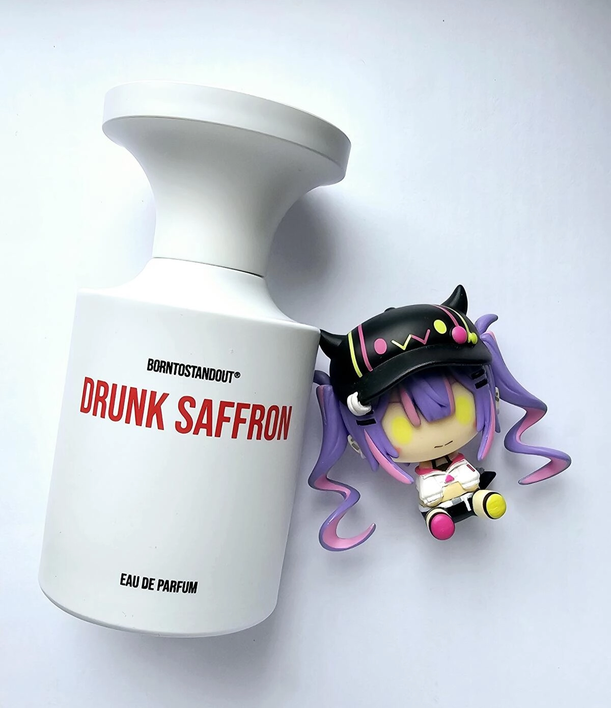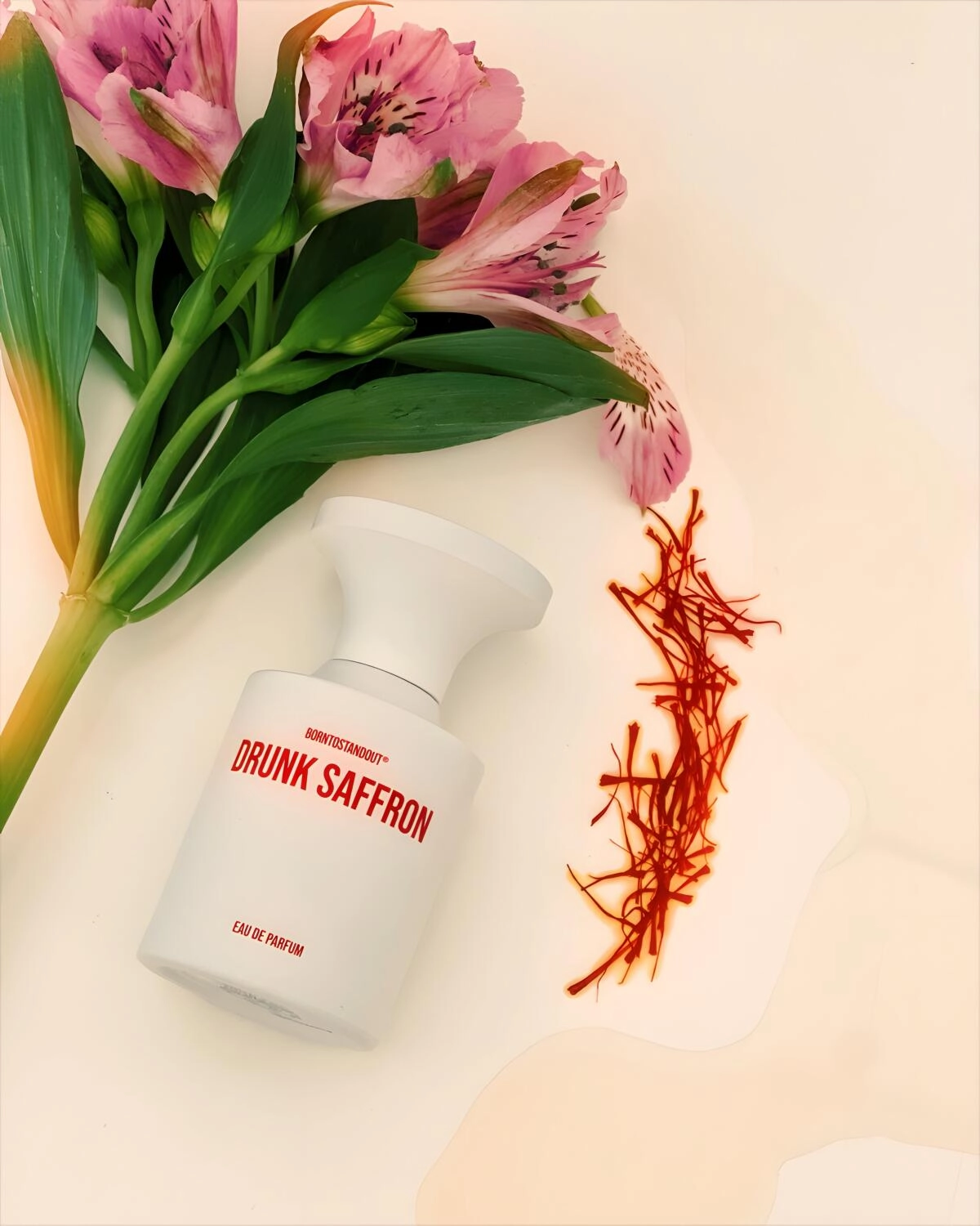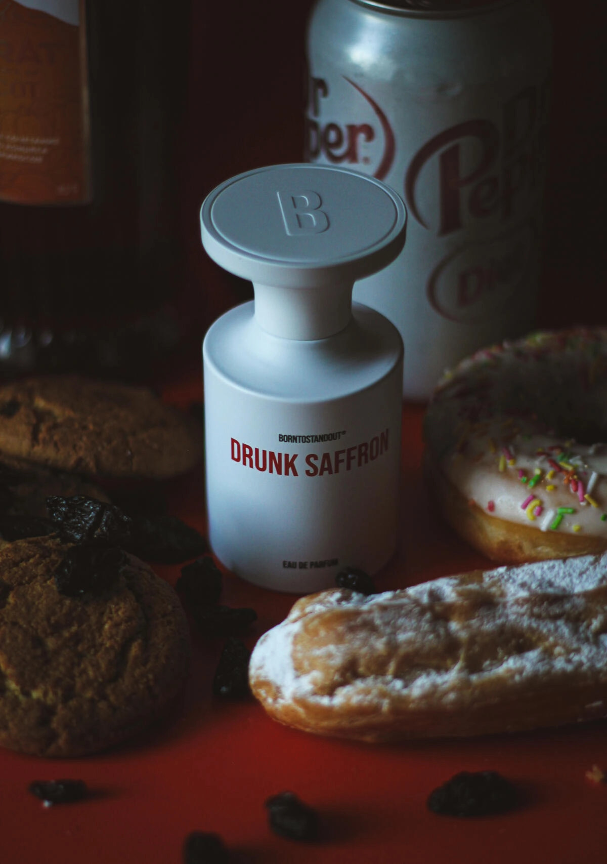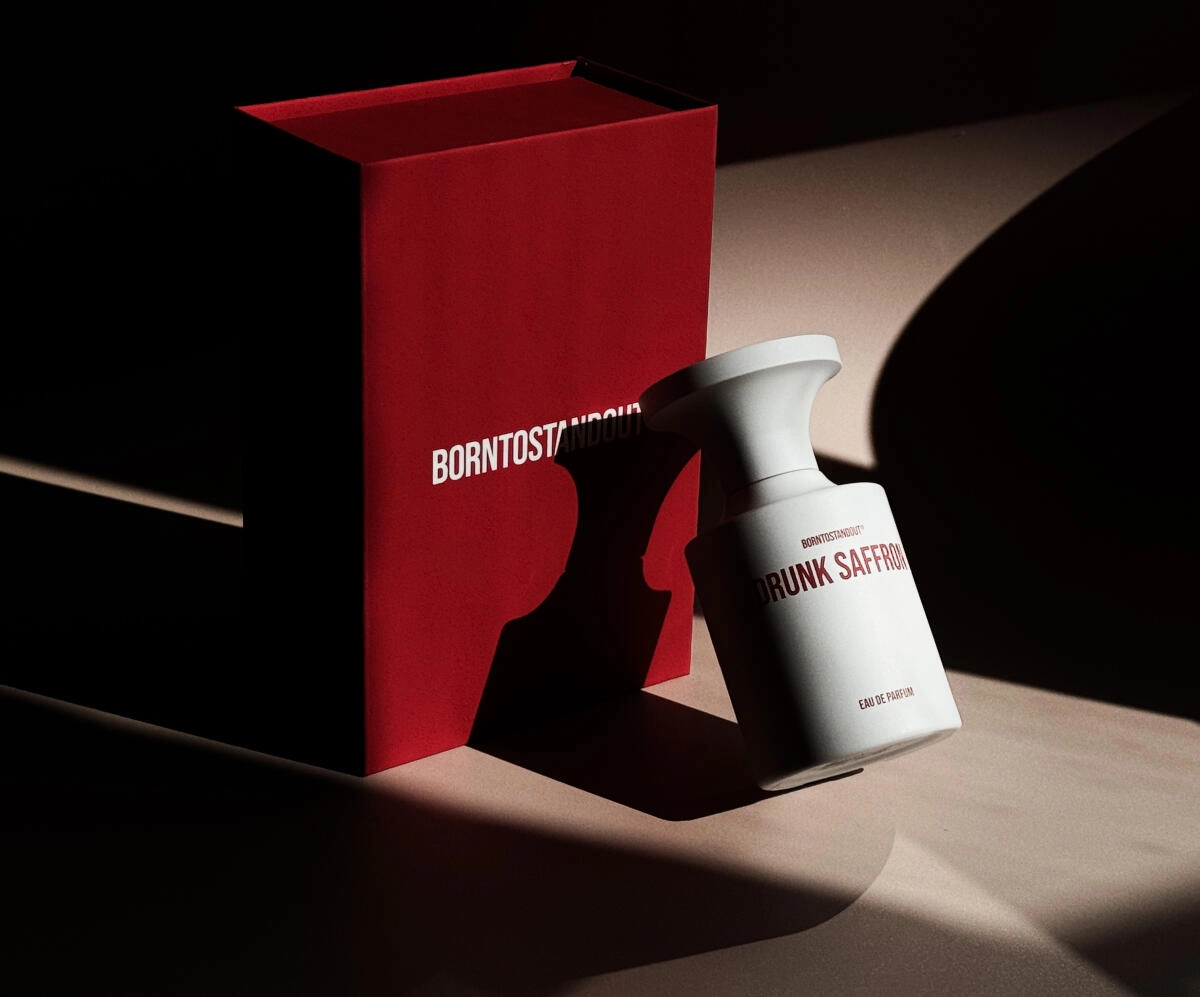 Аромат Borntostandout Drunk Saffron представляет собой уникальное унисекс-парфюмное решение молодой и бунтарской марки из Южной Кореи, которая была основана в 2022 году и стремится нарушить привычные нормы. Упаковка выполнена из белого фарфора в стиле Чосон и украшена сдержанными красными надписями. Парфюмер Honorine Blanc сравнивает этот аромат с бокалом коньяка, на поверхности которого остались следы губной помады.