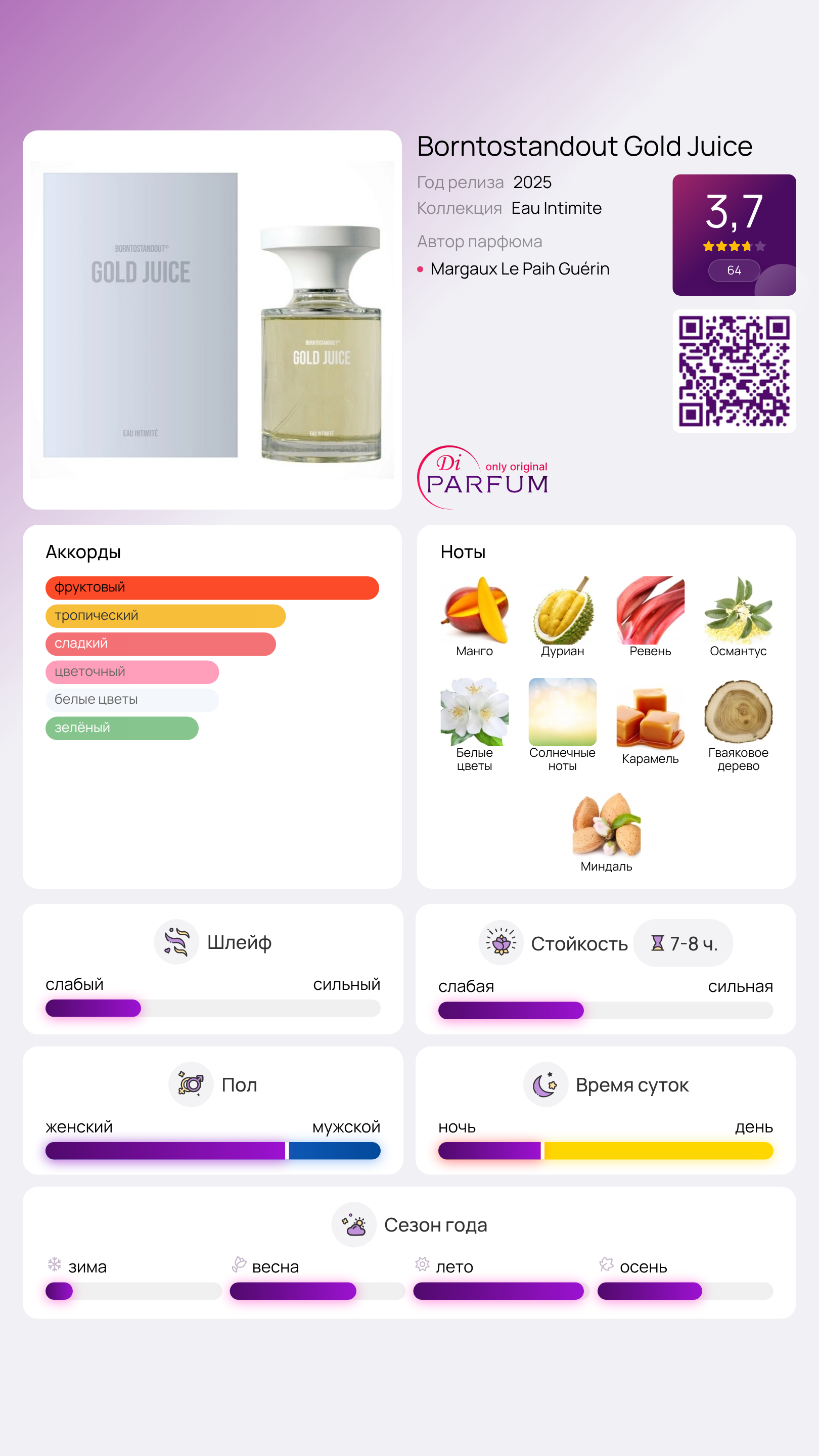 Gold Juice — это аромат, который начинается с резкости ревеня и уникального характера дуриана и манго. Сердце композиции проявляет более нежные стороны с абсолютом османтуса, белыми цветами и солнечными нотами, а в базе соединяются карамель, миндаль и гваяк, создавая сладко- древесный аккорд. Данный аромат можно описать как золотистый, обладающий гармонией яркости и глубины. Gold Juice прекрасно подойдет для тех, кто ищет нечто оригинальное в парфюмерии и хочет выделиться.