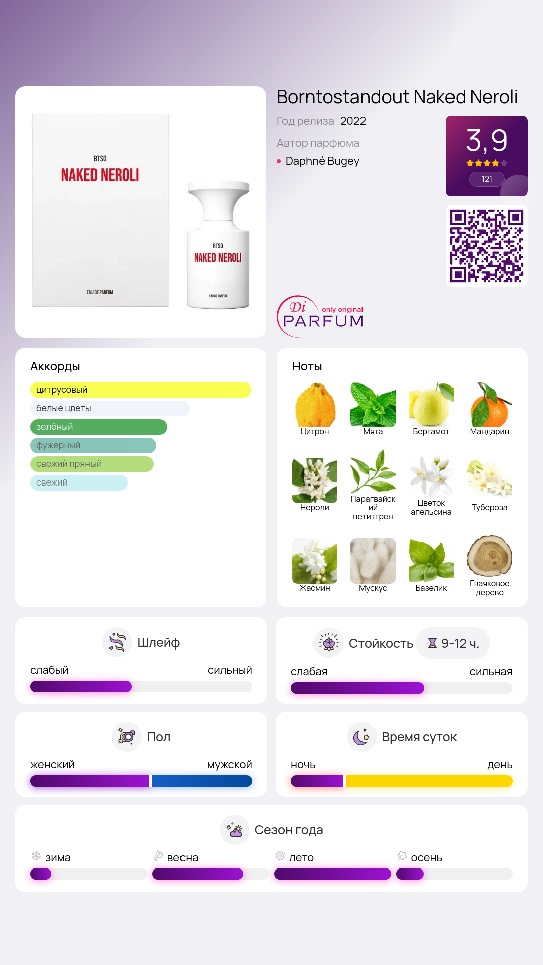 Naked Neroli от BORNTOSTANDOUT® — это цитрусово-ароматический парфюм для мужчин и женщин, выпущенный в 2022 году. За созданием этого аромата стоит парфюмер Дафна Бюже. В верхних нотах вы ощутите свежесть цитрона, мяты, бергамота и мандарина, что сразу погружает в атмосферу лета. Средние ноты раскрываются яркими акцентами нероли, парагвайского петитгрейна, апельсинового цвета, туберозы и болгарской розы, создавая цветочную гармонию. Завершают композицию базовые ноты жасмина, мускуса, базилика и гваякового дерева, придавая аромату глубину и стойкость.