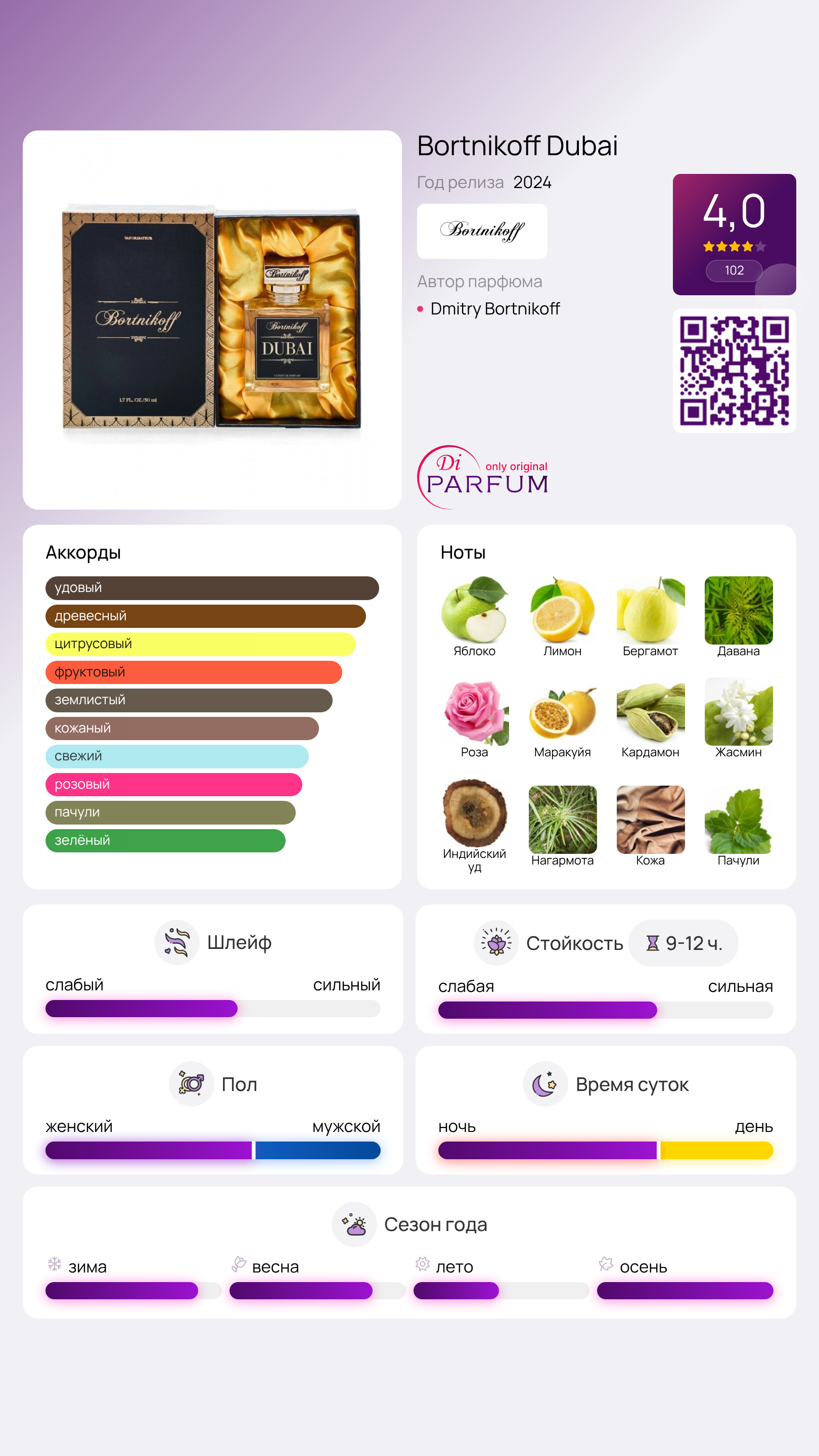 В базе аромата раскрываются насыщенные и глубокие ноты индийского уда, кожи, амбры и сандала, обрамленные благородными оттенками ветивера, пачули и мускуса, что придаёт композиции роскошный и загадочный характер. Dubai by Bortnikoff – это идеальный выбор для тех, кто стремится подчеркнуть свою индивидуальность и оставить незабываемый след wherever they go.