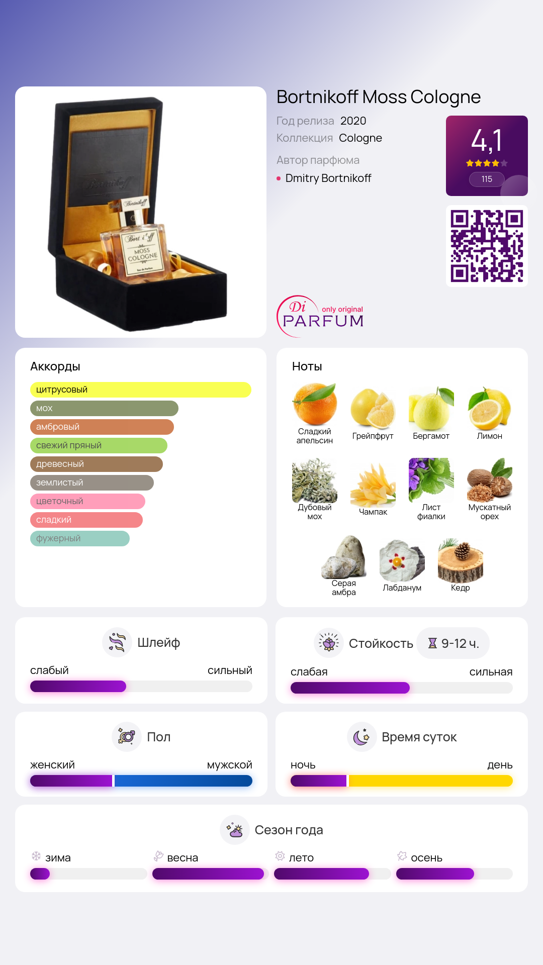 Moss Cologne от Bortnikoff — это уникальный шипрово-фруктовый аромат, предназначенный как для женщин, так и для мужчин. Выпущенный в 2020 году, этот парфюм стал настоящей находкой для любителей сложных и многослойных композиций. Партнёр по созданию этого аромата — выдающийся парфюмер Дмитрий Бортников, чье мастерство и страсть к парфюмерии видны в каждой ноте.