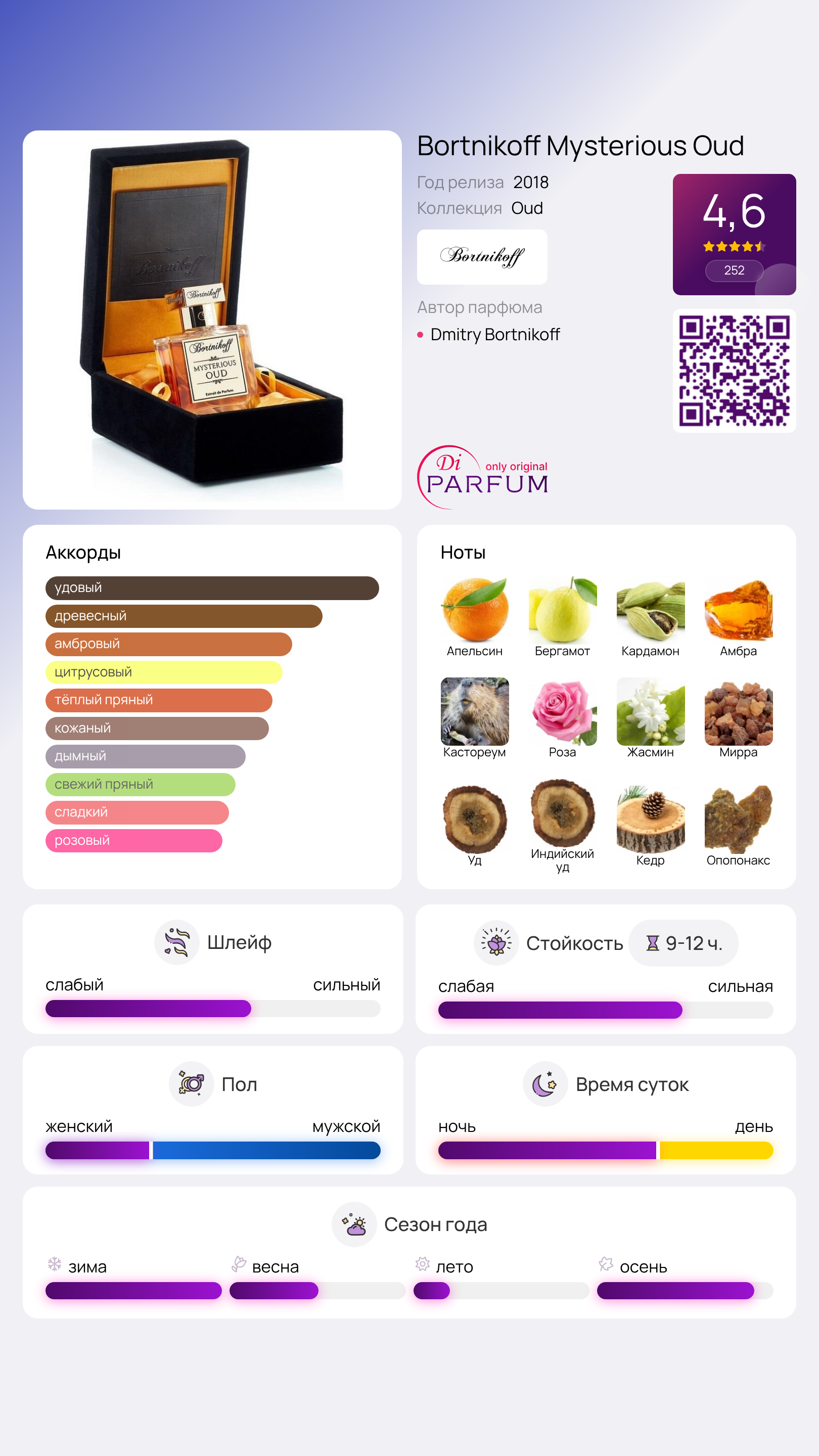 Эликсир Bortnikoff Mysterious Oud, представляющий собой уникальное древесно-восточное творение, стал символом нового поколения уда. Он олицетворяет аутентичный тайский бренд и демонстрирует лучшие достижения данного парфюмерного дома. Аромат рассказывает о сильной, мудрой и смелой личности, открытой миру.