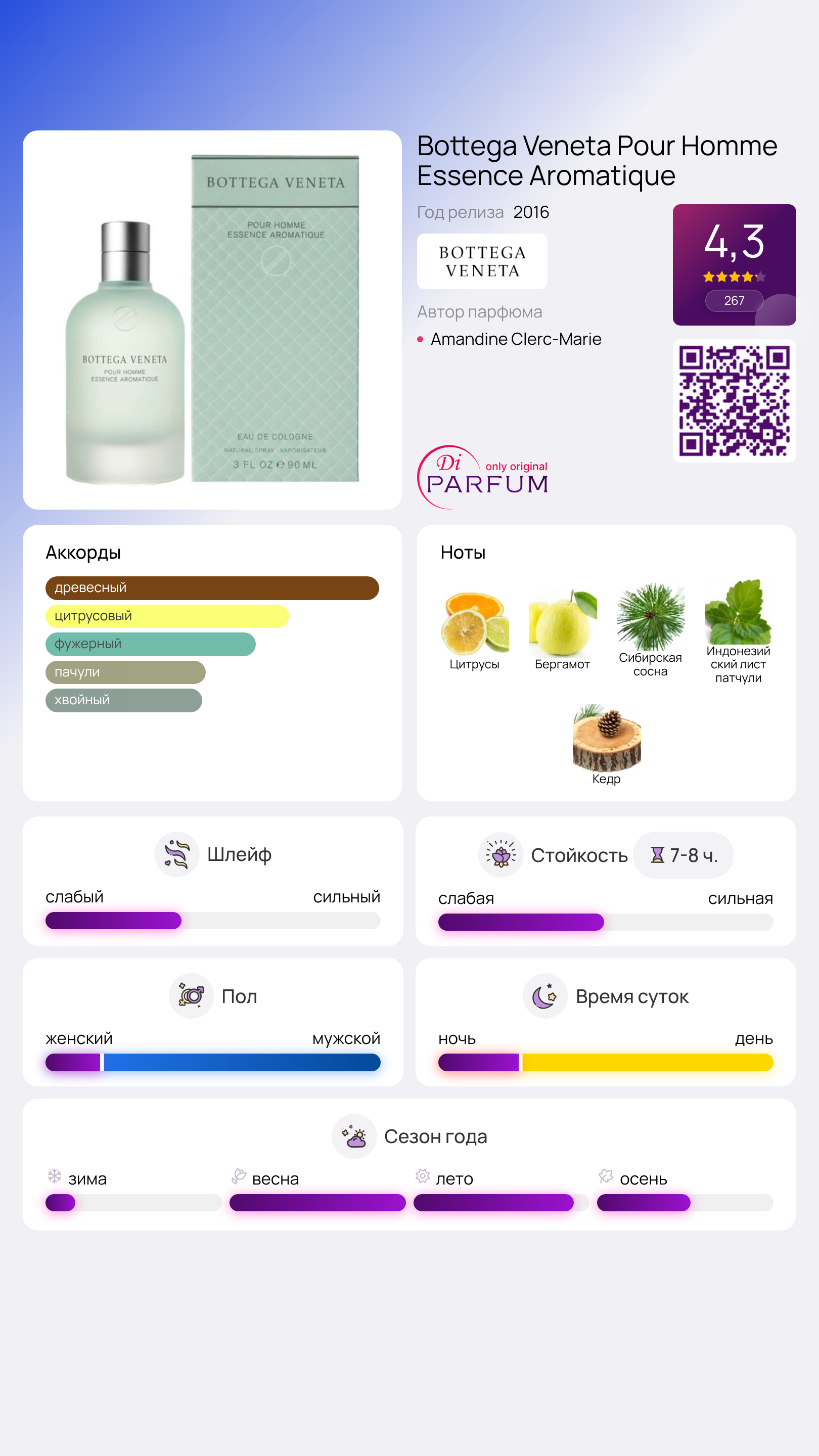 Pour Homme Essence Aromatique – это древесно-фужерный аромат для мужчин, созданный итальянским парфюмерным брендом Bottega Veneta в дополнение к женской версии Essence Aromatique. Характерный для этого парфюма был разработан парфюмером Аманди́н Марией, которая сформировала композицию, придающую энергию и бодрость.