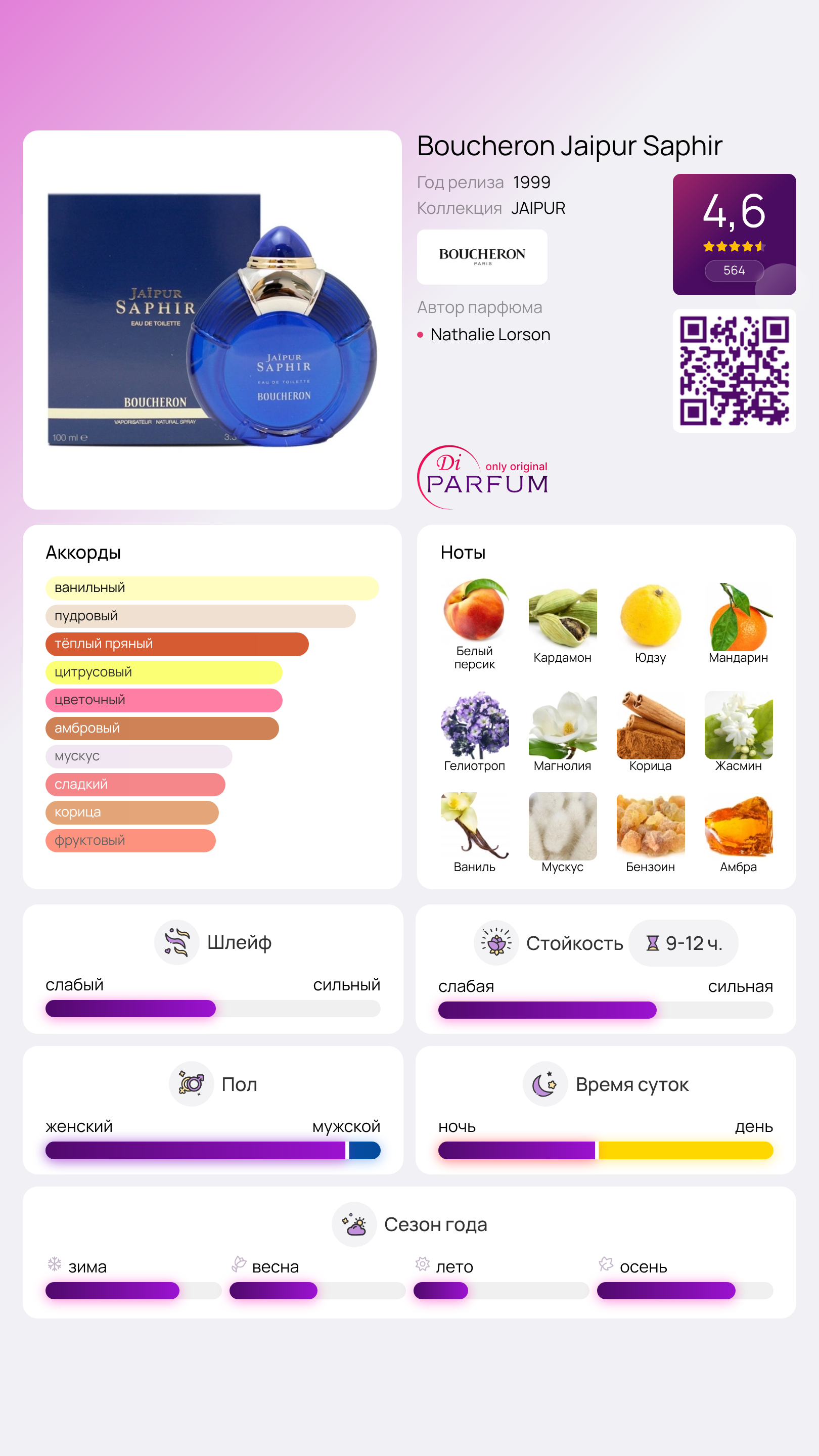 В 1999 году знаменитая ювелирная компания Boucheron расширила свою коллекцию парфюмов, выпустив восточный аромат под названием Jaipur Saphir. Этот запах олицетворяет красоту драгоценных сапфиров, созданную искусным парфюмером путем сочетания ярких нот юзу и мандарина.