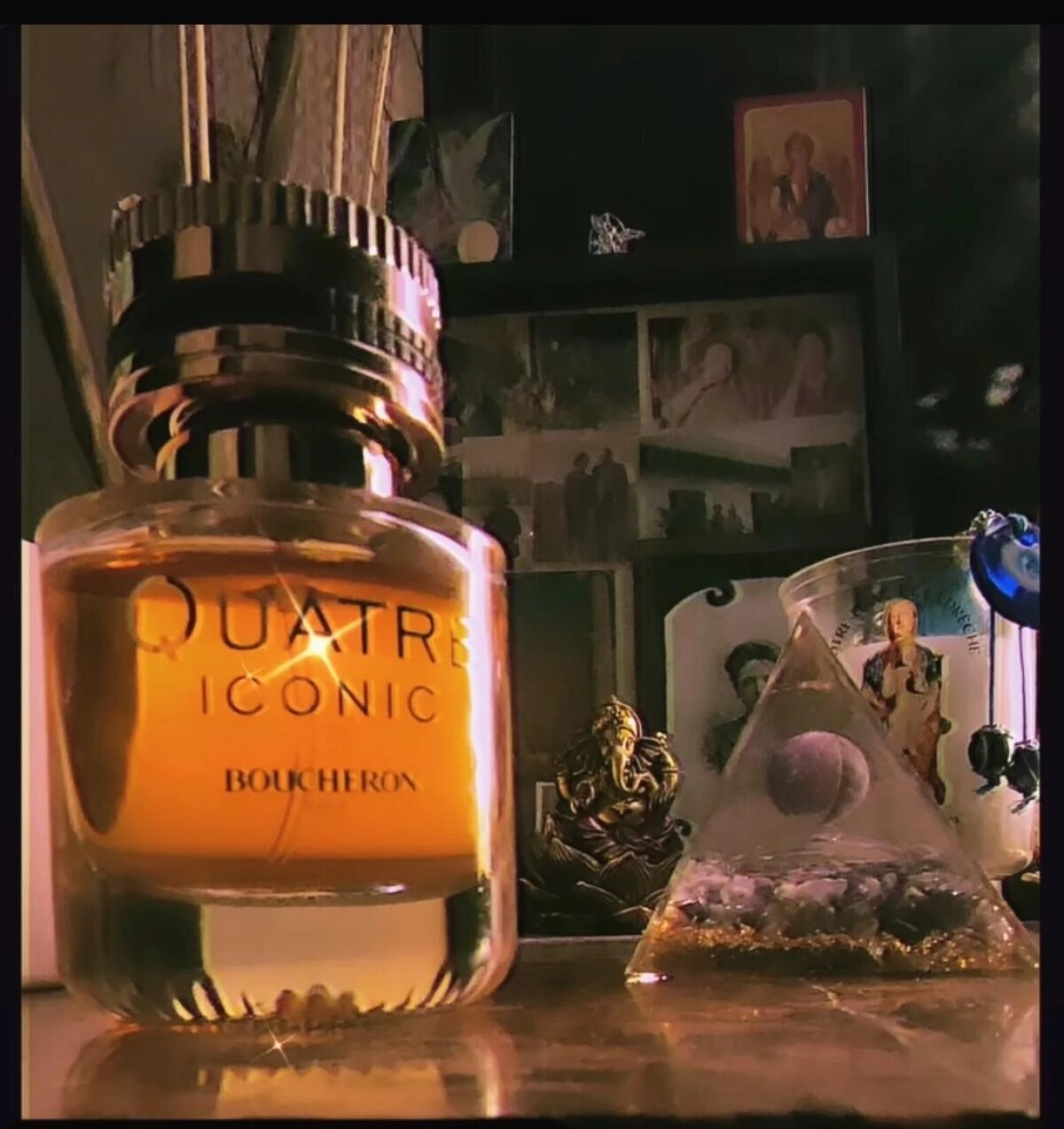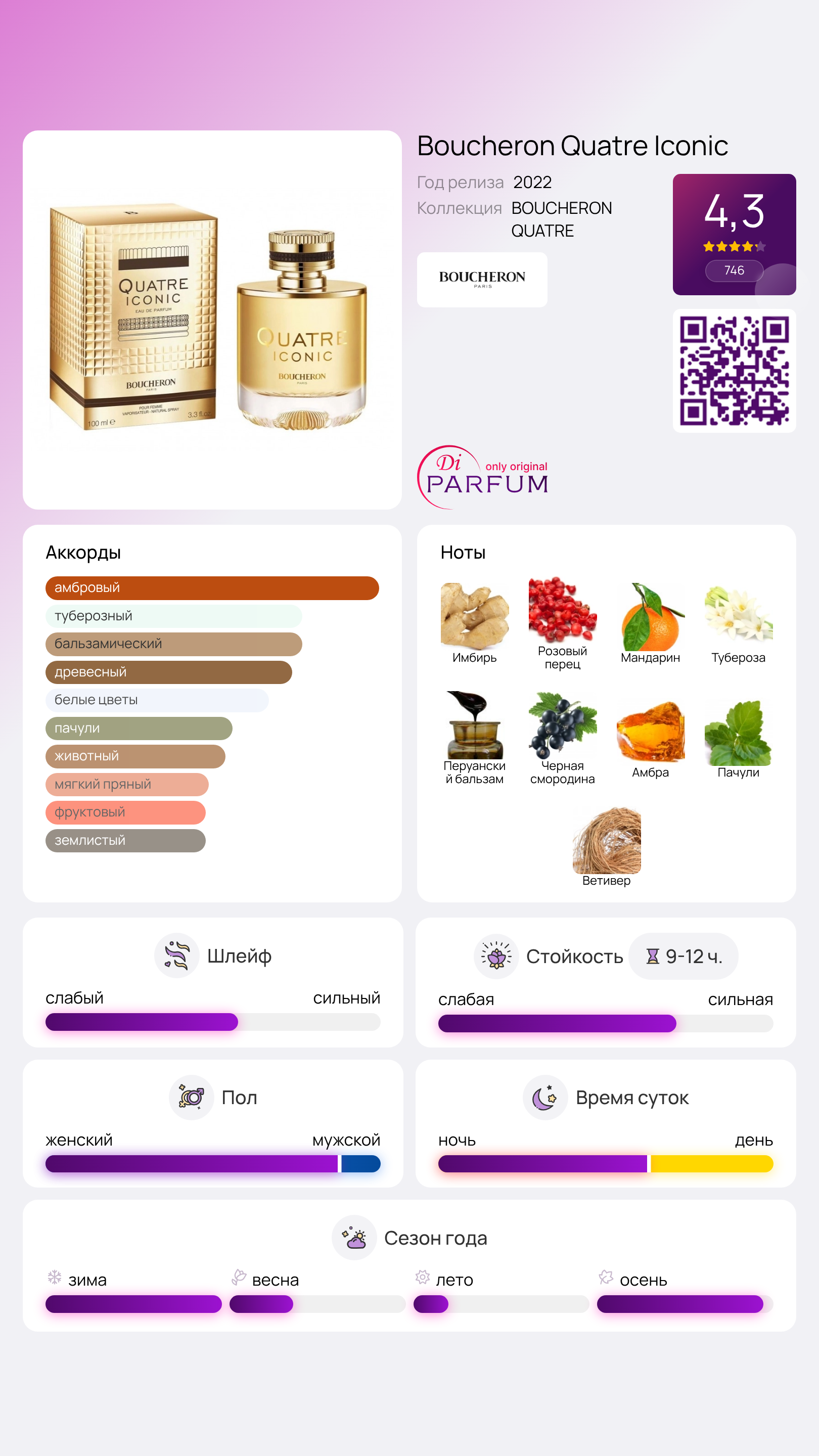 В сердце композиции ощущается насыщенный перуанский бальзам, придающий аромату бальзамическую глубину, а терпкий смородиновый сок добавляет пикантности. Прекрасная тубероза сверкает словно капли янтарного меда, ослепляя своим блеском. Шлейф Boucheron Quatre Iconic окутан чувственной мускусно-минеральной амброй, которая притягательно манит, в то время как землистый ветивер и загадочный дымно-кофейный лист пачули подчеркивают недоступность настоящей королевы.