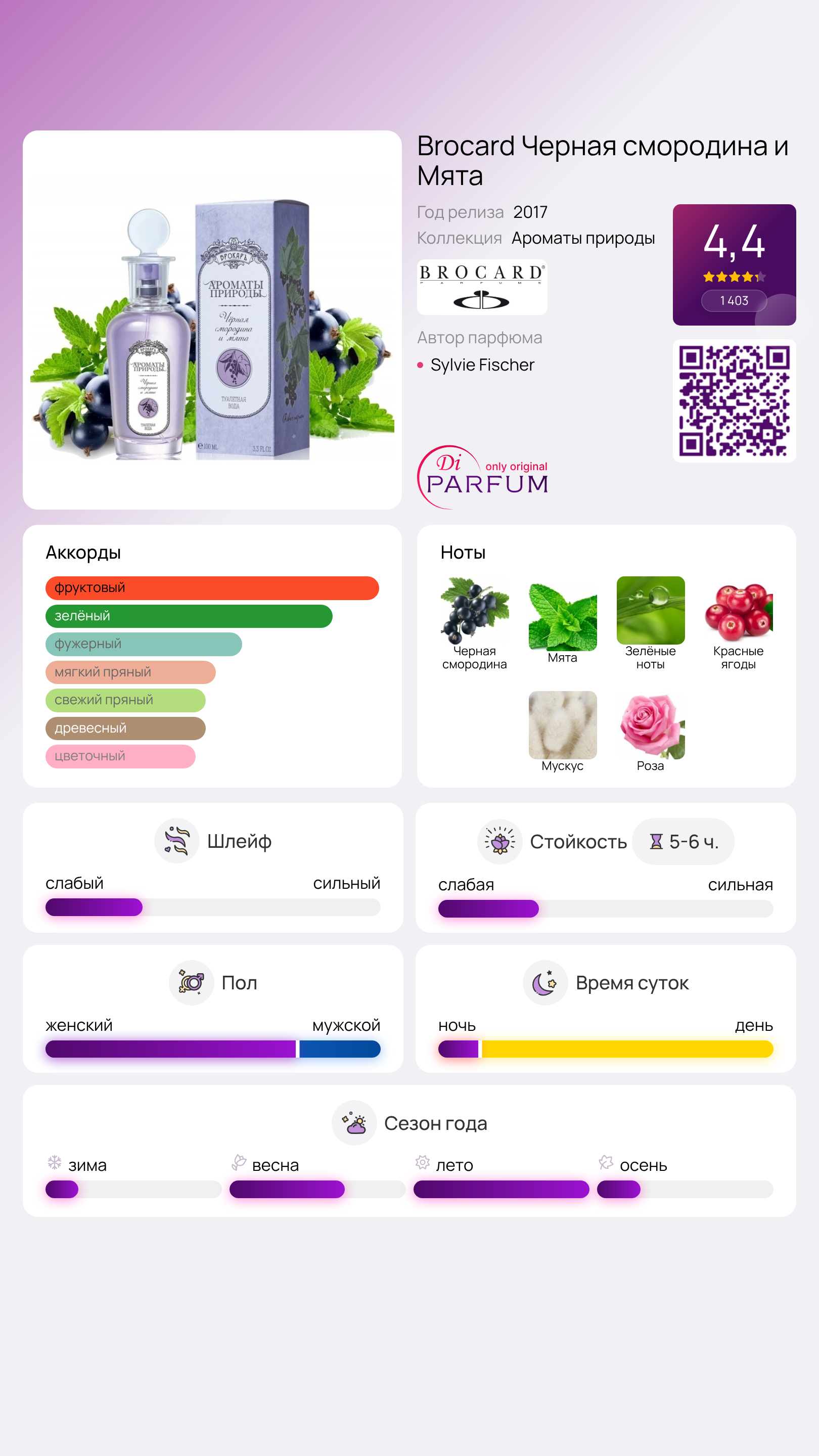 Что же произойдет с ягодами, помещенными в нежный фиолетовый флакон? Это будет ароматное варенье? Может, аппетитные пироги по бабушкиному рецепту? Или они будут съедены прямо под кустом? Неповторимая королева цветов дополнена бодрящими зелеными нотами в большом количестве. Глубокий шлейф создает атмосферу сумерек с медовой розой и пикантными красными ягодами. Уютный эликсир Черная смородина и Мята был выпущен Brocard в 2017 году в рамках коллекции «Ароматы Природы». В нем собраны истинные ароматы российских садов и лесов, что позволяет вам окунуться в расслабляющее летнее настроение, даже когда за окном зима. Этот парфюм – не просто аромат, а живое воспоминание о прекрасных моментах жизни.