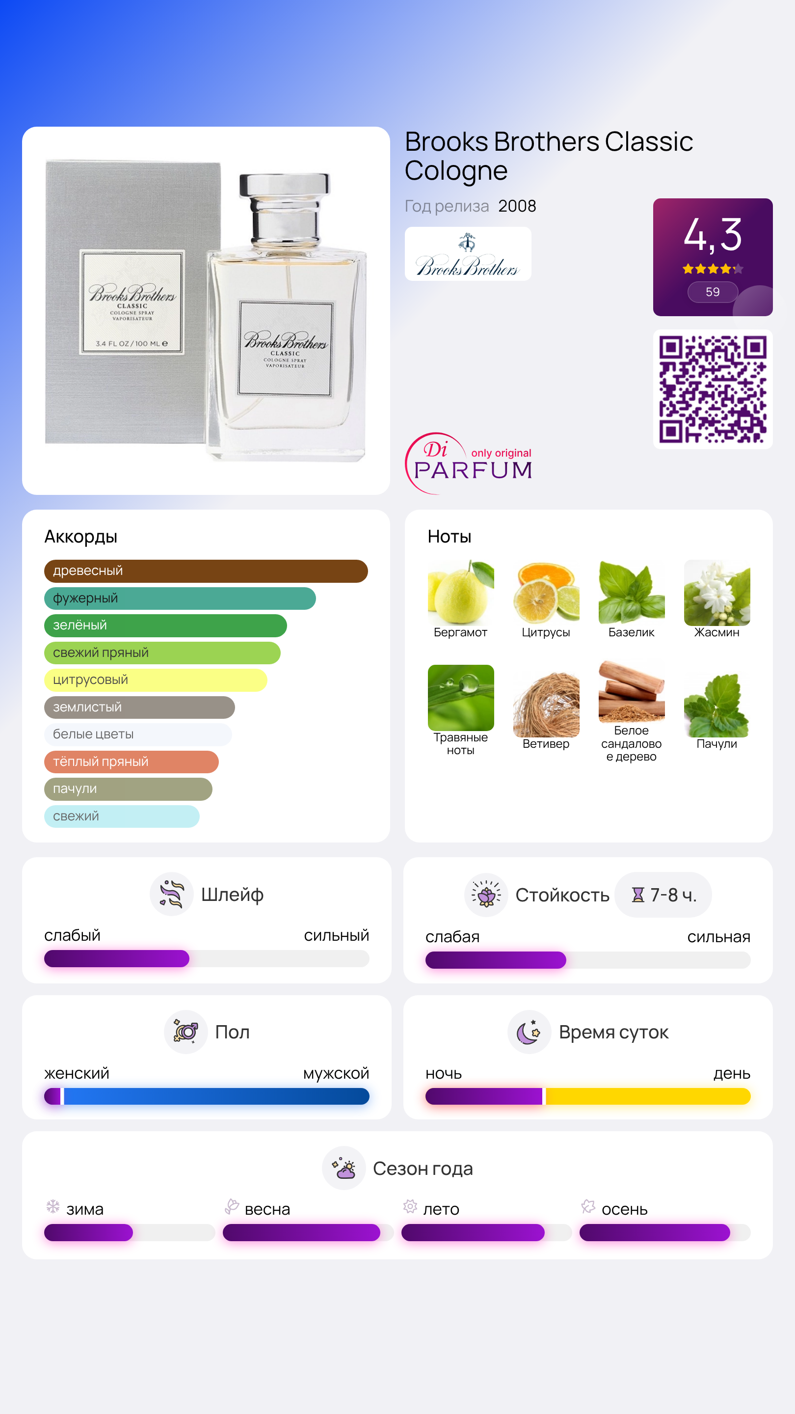Известная американская компания Brooks Brothers, занимающаяся производством мужской одежды, не могла обойти стороной создание своей линии парфюмерии. К качественным предметам одежды должны прилагаться и соответствующие ароматы. Одним из ярких примеров стал Classic Cologne – парфюм, относящийся к фужерной группе и уже заслуженно считающийся классикой. Начало композиции открывается цитрусовыми нотами и бергамотом, после чего раскрываются зеленые аккорды в сердце, дополненные жасмином и базиликом.
