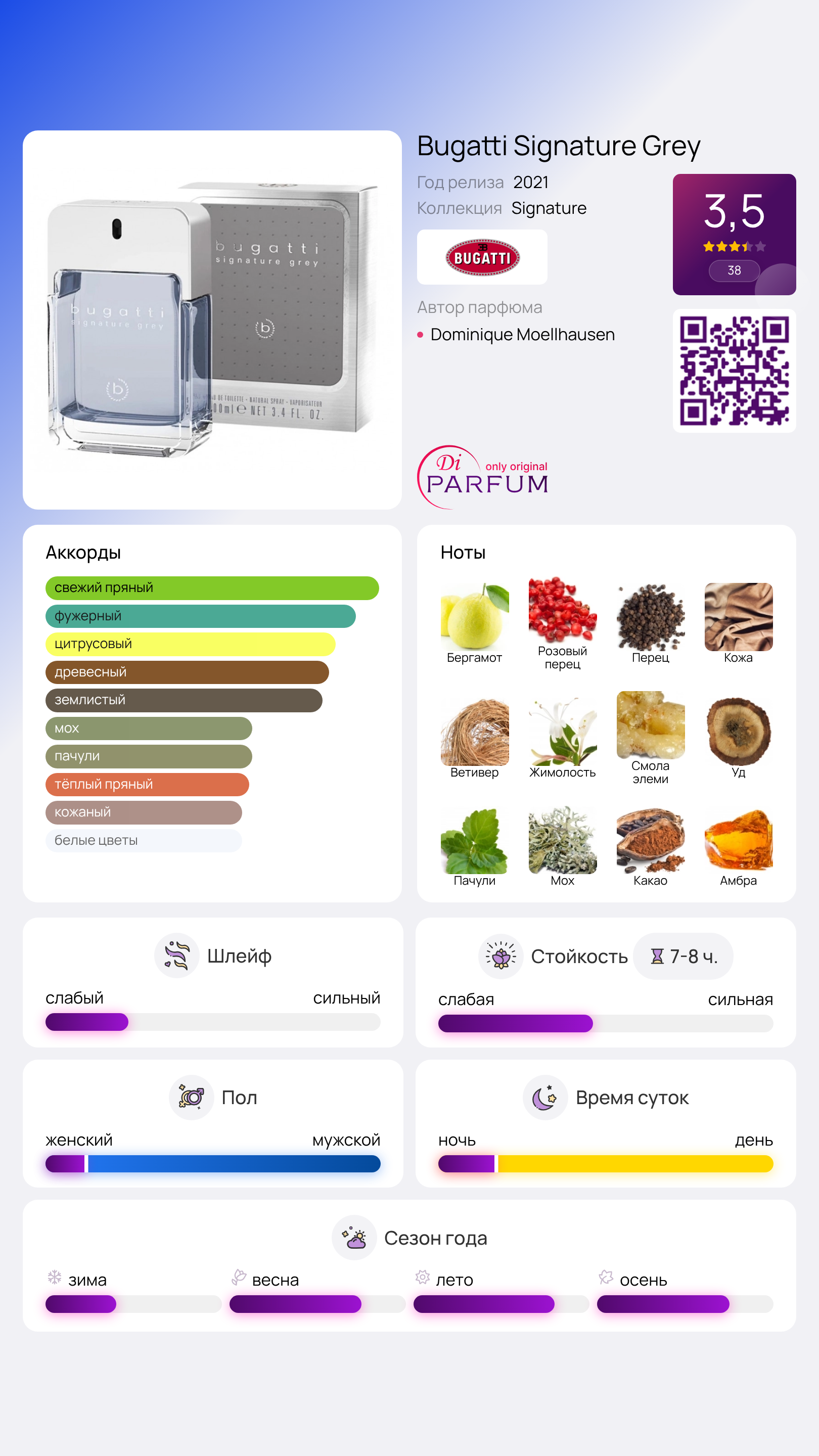 Signature Grey от Bugatti Fashion - это Восточно-древесный аромат для мужчин, который был представлен в 2021 году. За созданием этого уникального парфюма стоит талантливый парфюмер Доминик Мёлхаузен.