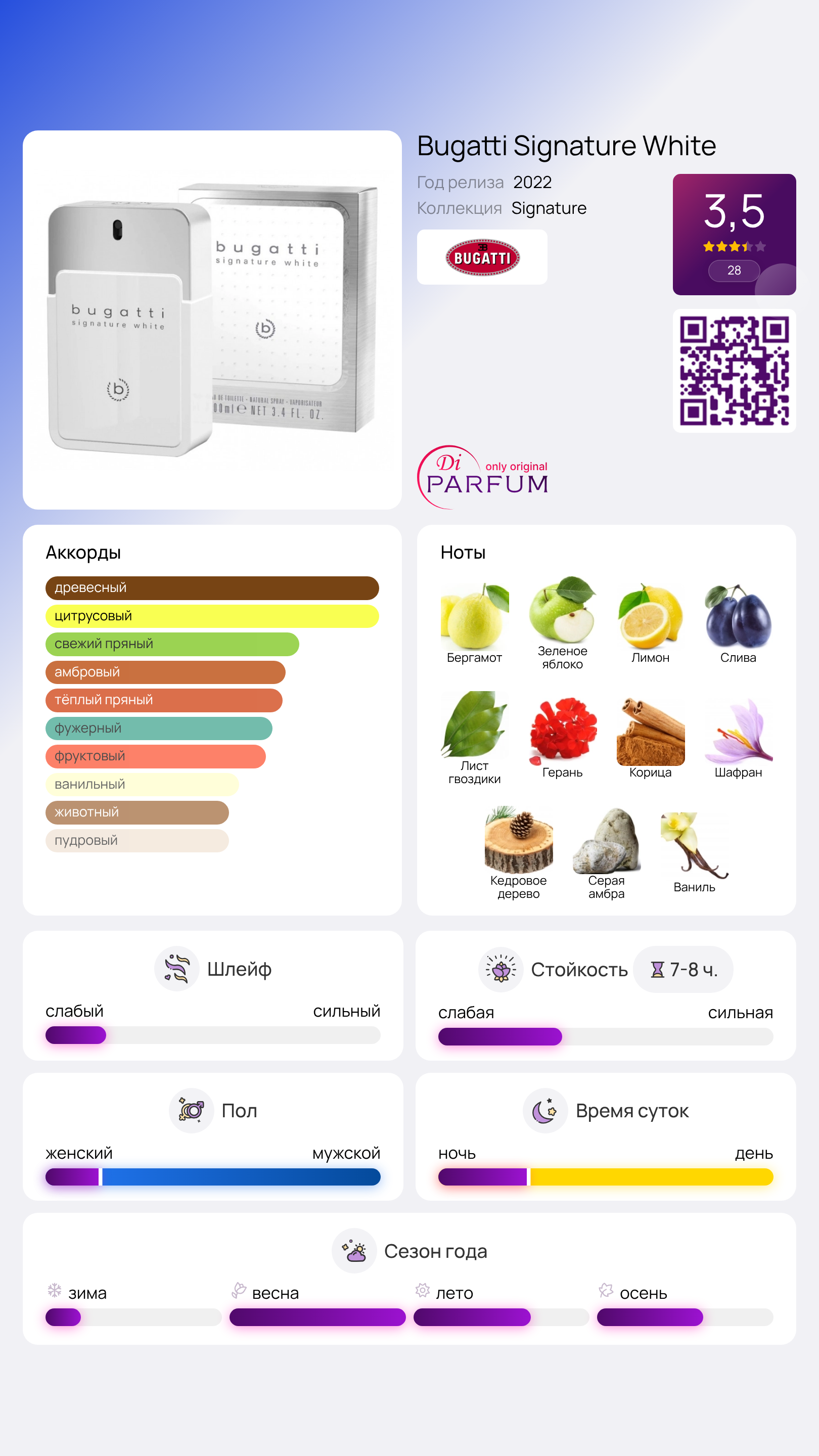 Signature White от Bugatti Fashion – это цитрусово-ароматический парфюм для мужчин, который был выпущен в 2022 году. Этот свежий и яркий аромат идеально подходит для повседневного использования, даря ощущение легкости и яркости.