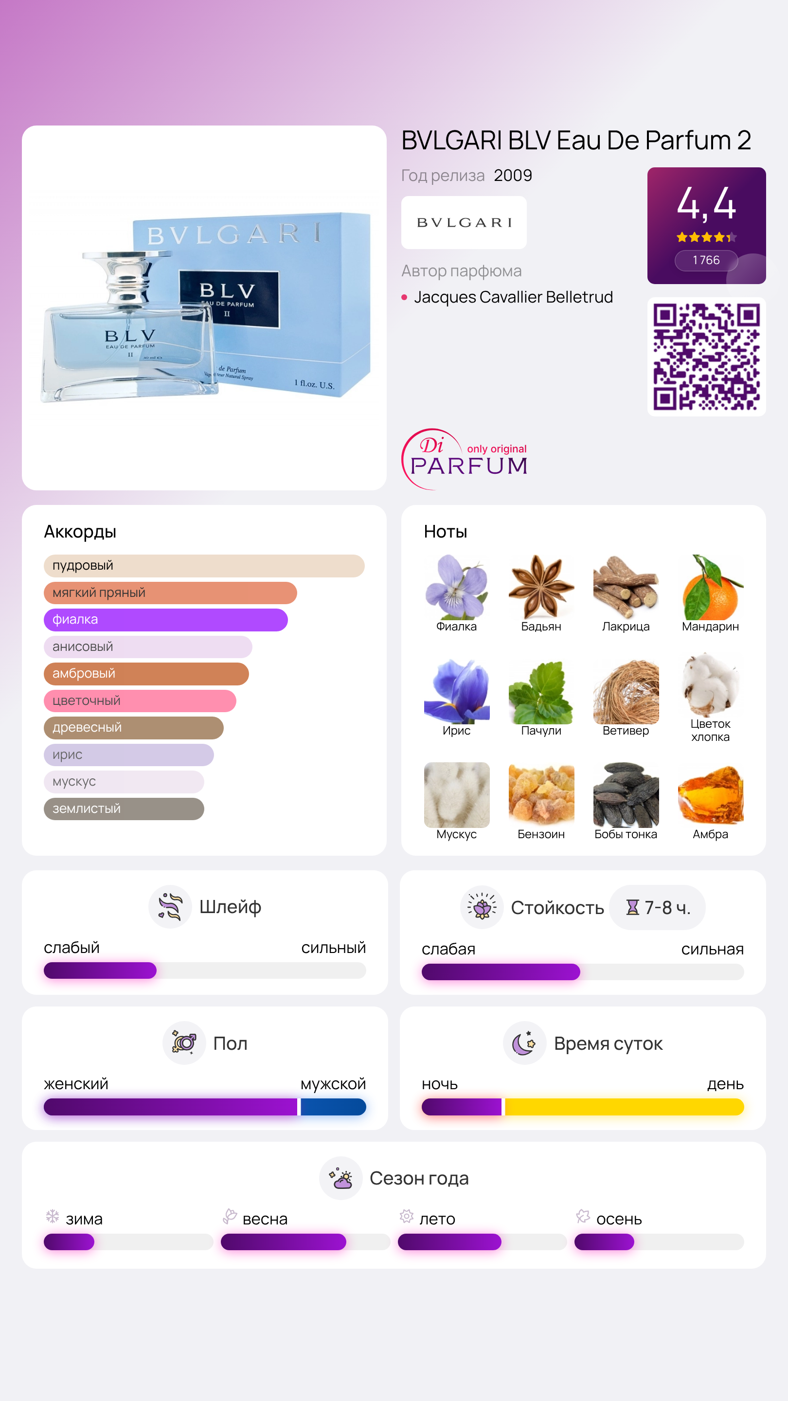 Парфюм BLV Eau De Parfum 2 открывается изысканными оттенками фиалки, дополненными свежестью мандарина, а также нотами лакрицы и звездчатого аниса. В сердце аромата располагается ирис, окруженный теплыми аккордами ветивера и пачули.
