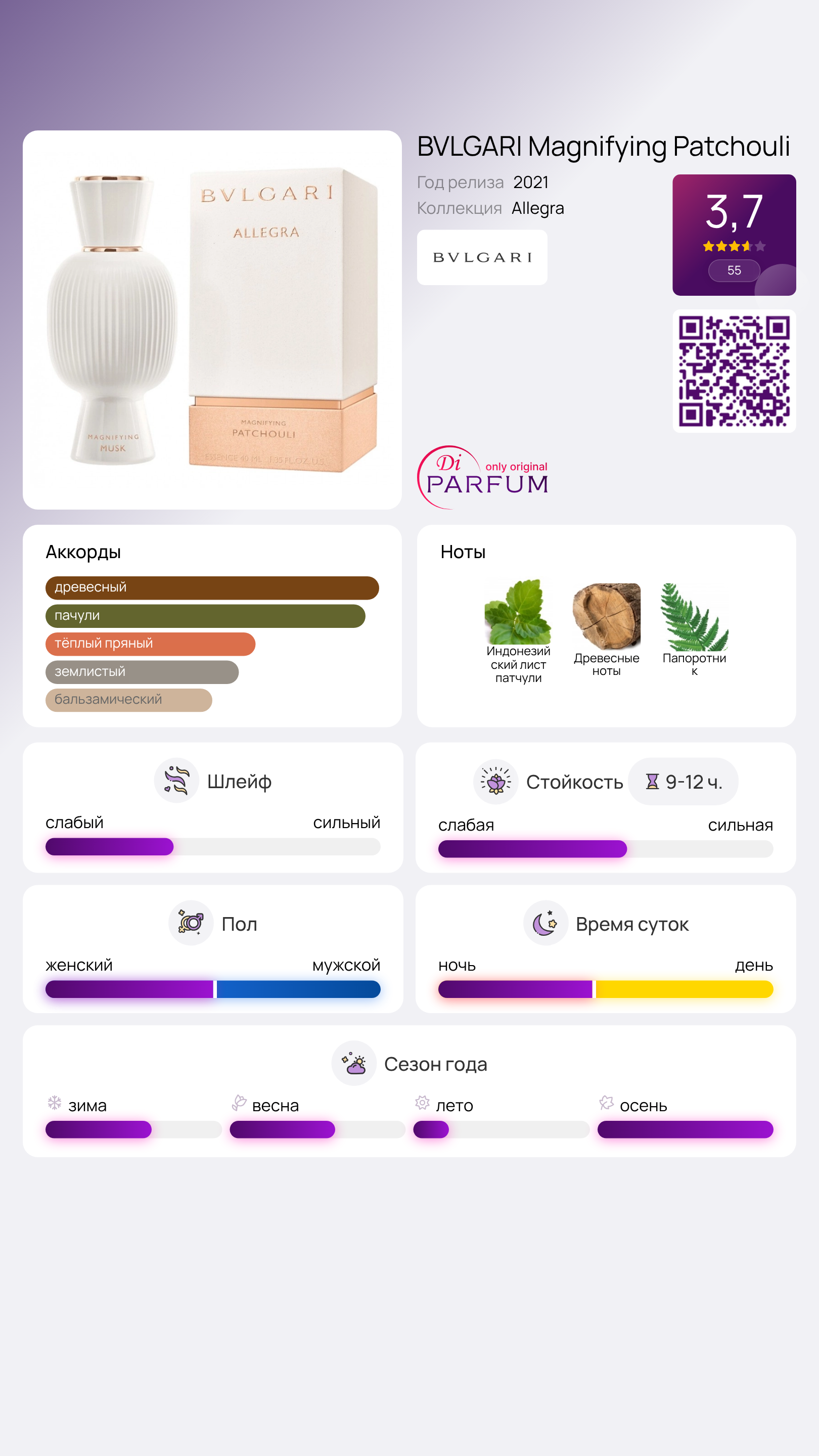 Allegra Magnifying Patchouli Essence от Bvlgari – это удивительный шипровый древесный аромат для женщин, который впервые был представлен в 2021 году. Этот парфюм идеально сочетает в себе ноты, которые подчеркивают утонченность и индивидуальность его обладательницы.