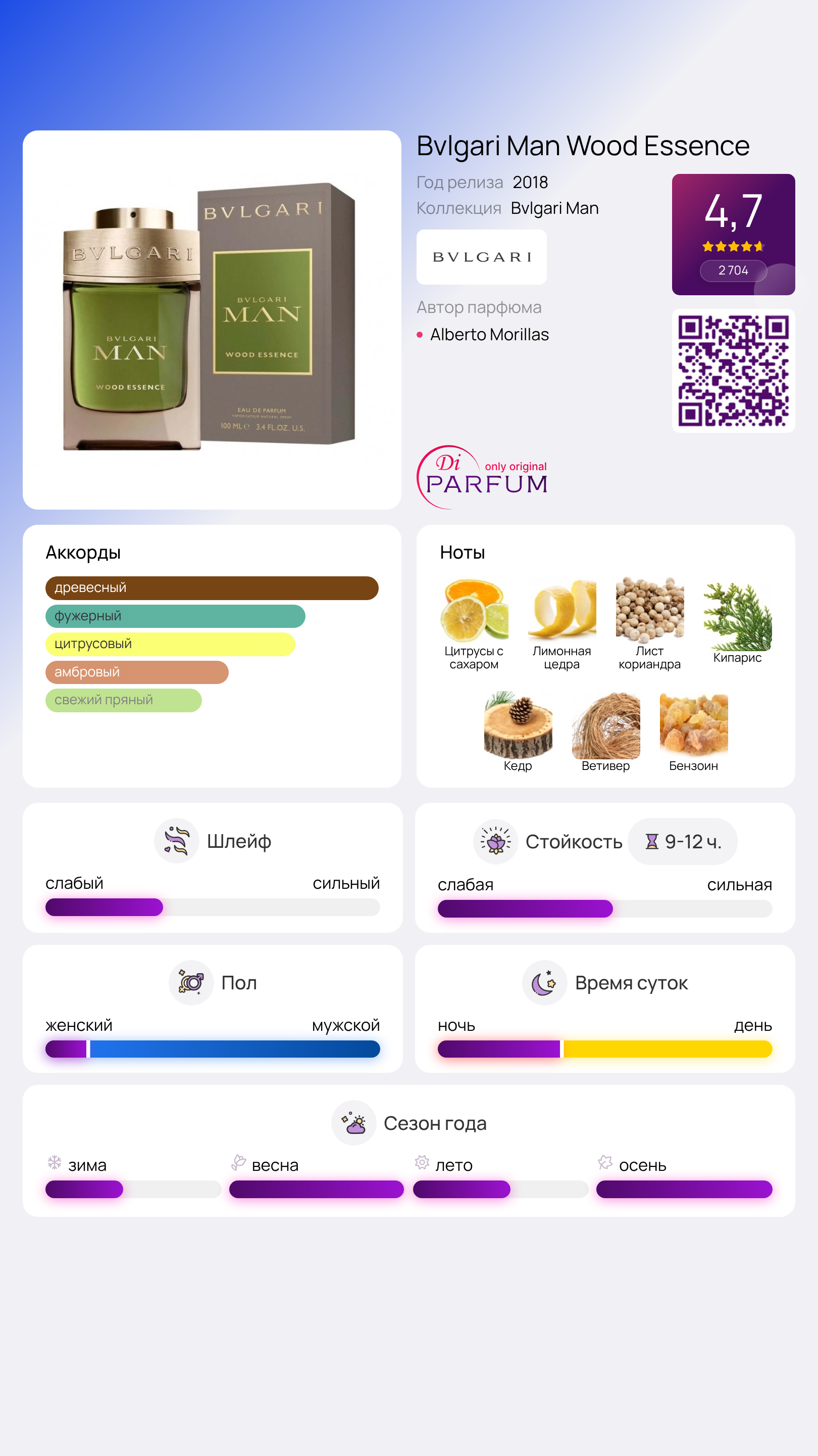 Локацией для презентации стал Sky Park в Лондоне – высшая точка города. Среди роскошной растительности и с потрясающим видом на мегаполис впервые была раскрыта эта древесная формула. В самом начале композиции сочетаются ноты цитрусов, сахара, лимонной цедры и листа кориандра. В сердце парфюма звучит гармония белого кедра, кипариса и кориандра, а базу составляет бензоин.