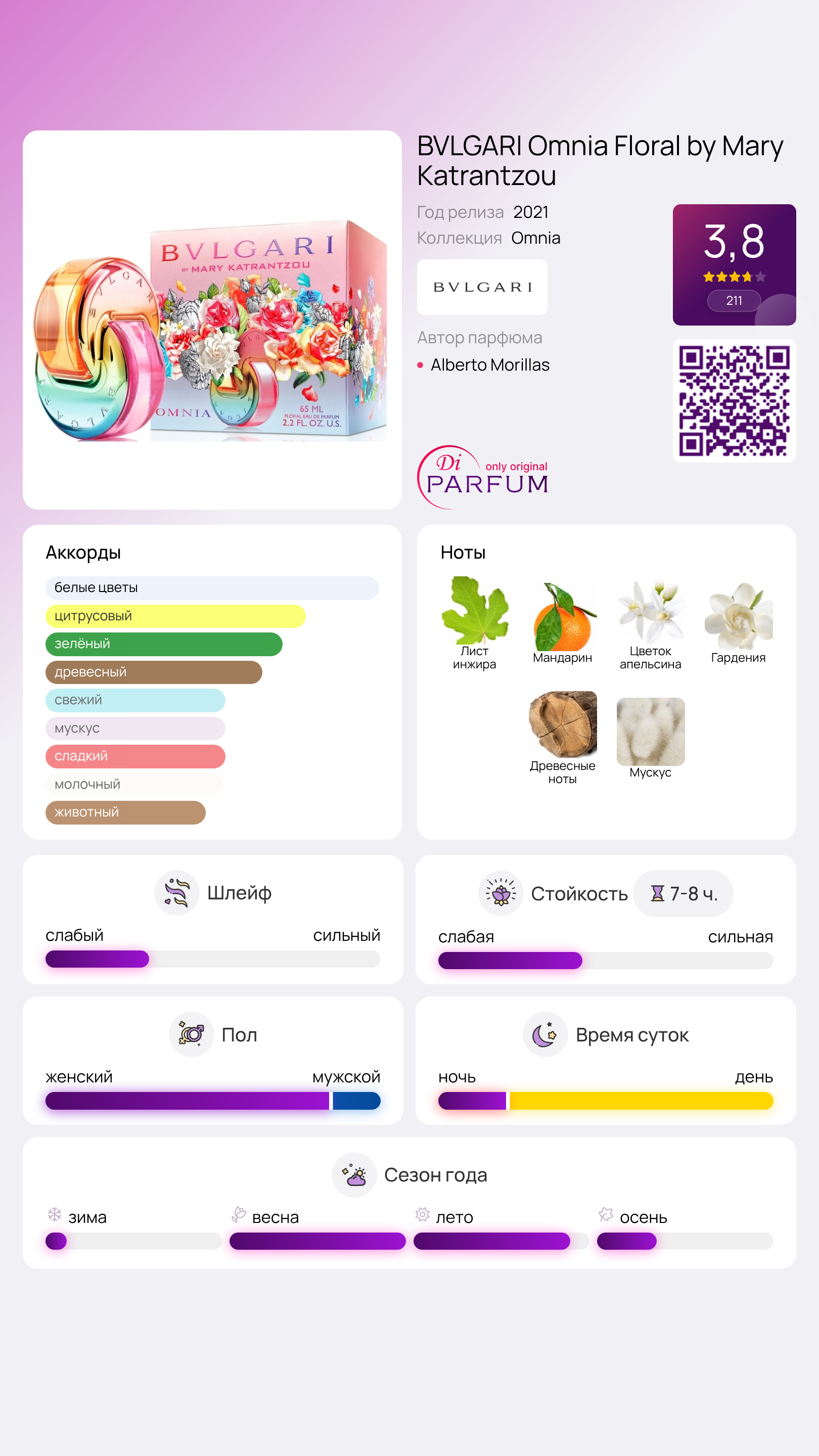 Эта впечатляющая композиция Omnia by Mary Katrantzou от BVLGARI была презентована в 2021 году в рамках коллекции Omnia. Она способна освежить обыденные серые дни каждой женщины, вызывая ассоциации с ароматической Вселенной Оптимизма, что создает отличное настроение. Аромат станет прекрасным выбором для тех, кто смел и уверен в себе, а также для веселых натур. Уникальный радужный флакон дизайна напоминает скульптуру вазы, наполненной цветами, отражая разнообразие ароматов всей коллекции.
