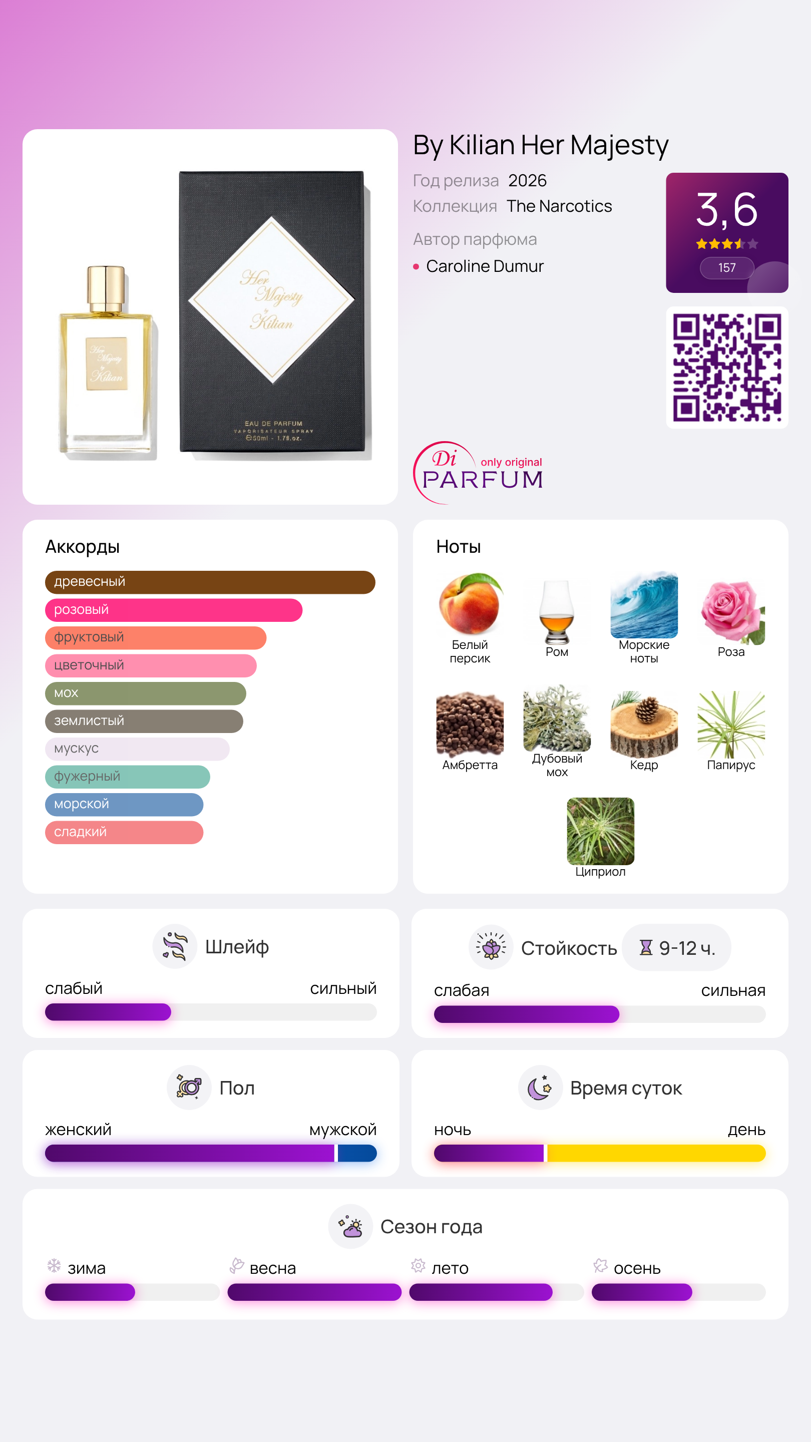 Парфюм входит в семью наркотику, подчеркивая свою уникальность и насыщенность. Kilian Paris Her Majesty доступен в объемах 50 мл Eau de Parfum и 100 мл с возможностью пополнения.