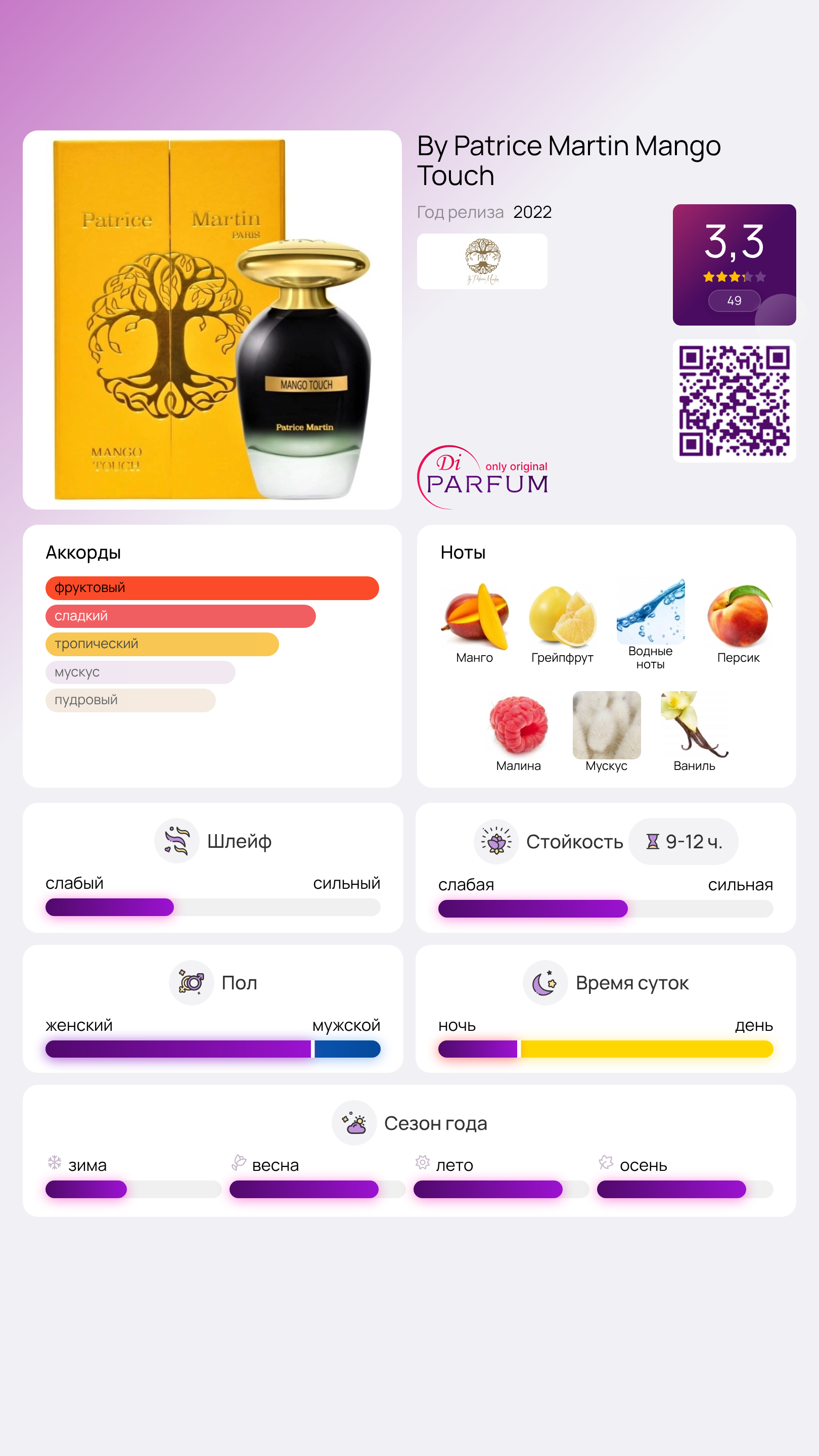 Фруктово-ягодное сияние вызывает радость и незабываемые воспоминания о летних днях. Шлейф аромата окутывает чувственным мускусом с мягким привкусом ванили. Mango Touch от By Patrice Martin оставляет яркое, радостное впечатление и предназначен как для мужчин, так и для женщин, предпочитающих тропическую парфюмерию. Градиентный флакон с золотой крышкой становится «визитной карточкой» этого французского бренда.