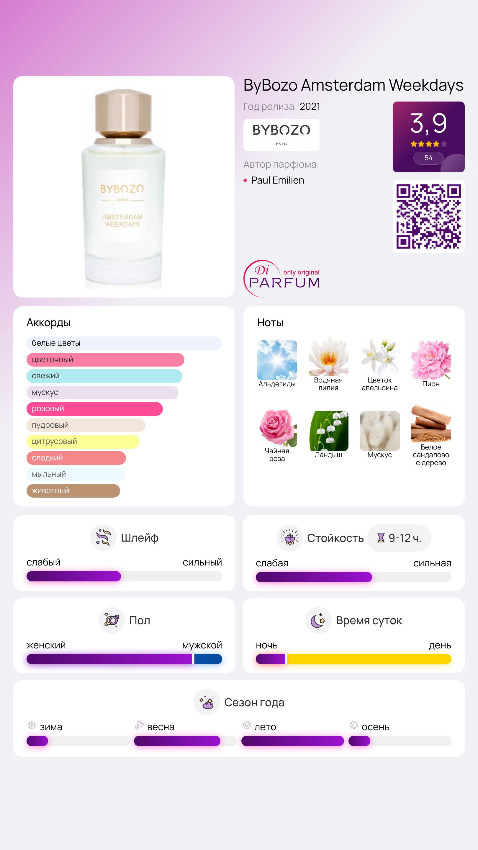 Аромат ByBozo Amsterdam Weekdays представляет собой утончённое цветочно-мускусное-деревянное сочетание, которое вдохновляет на переживание будних дней в Амстердаме. Это изящная композиция, состоящая из сладковатых и свежих нежных розовых и белых цветов, напоминающая легкую акварель, созданную японским мастером, изображающую цветущую сакуру.