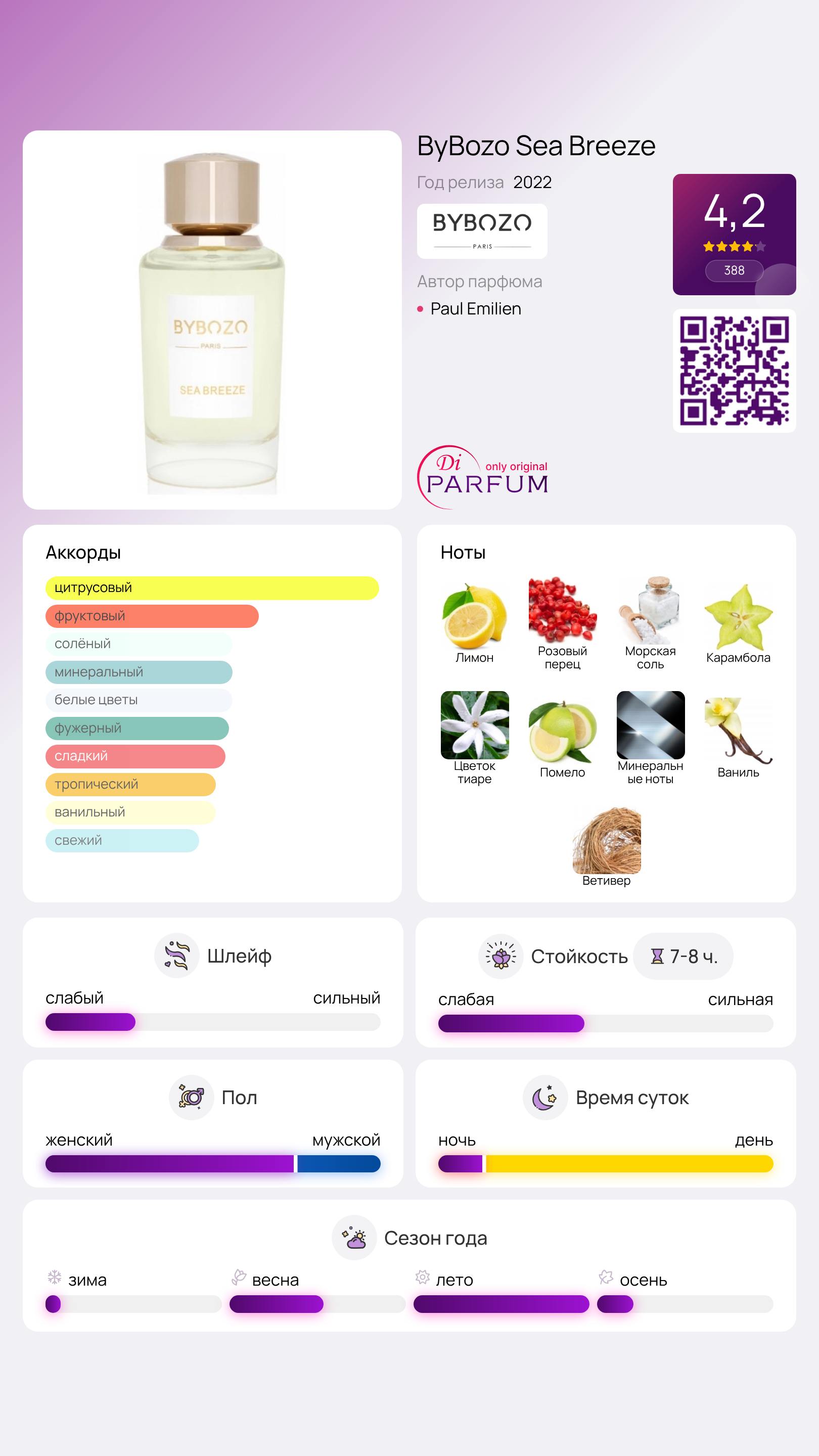 Аромат-унисекс ByBozo Sea Breeze, созданный талантливым Полем Эмильеном, является олицетворением легкости, оптимизма и свежести. Он моментально отвлекает от повседневных забот и уносит в идиллическое место, где царит спокойствие и умиротворение, а время словно останавливается, чтобы насладиться каждым мгновением.