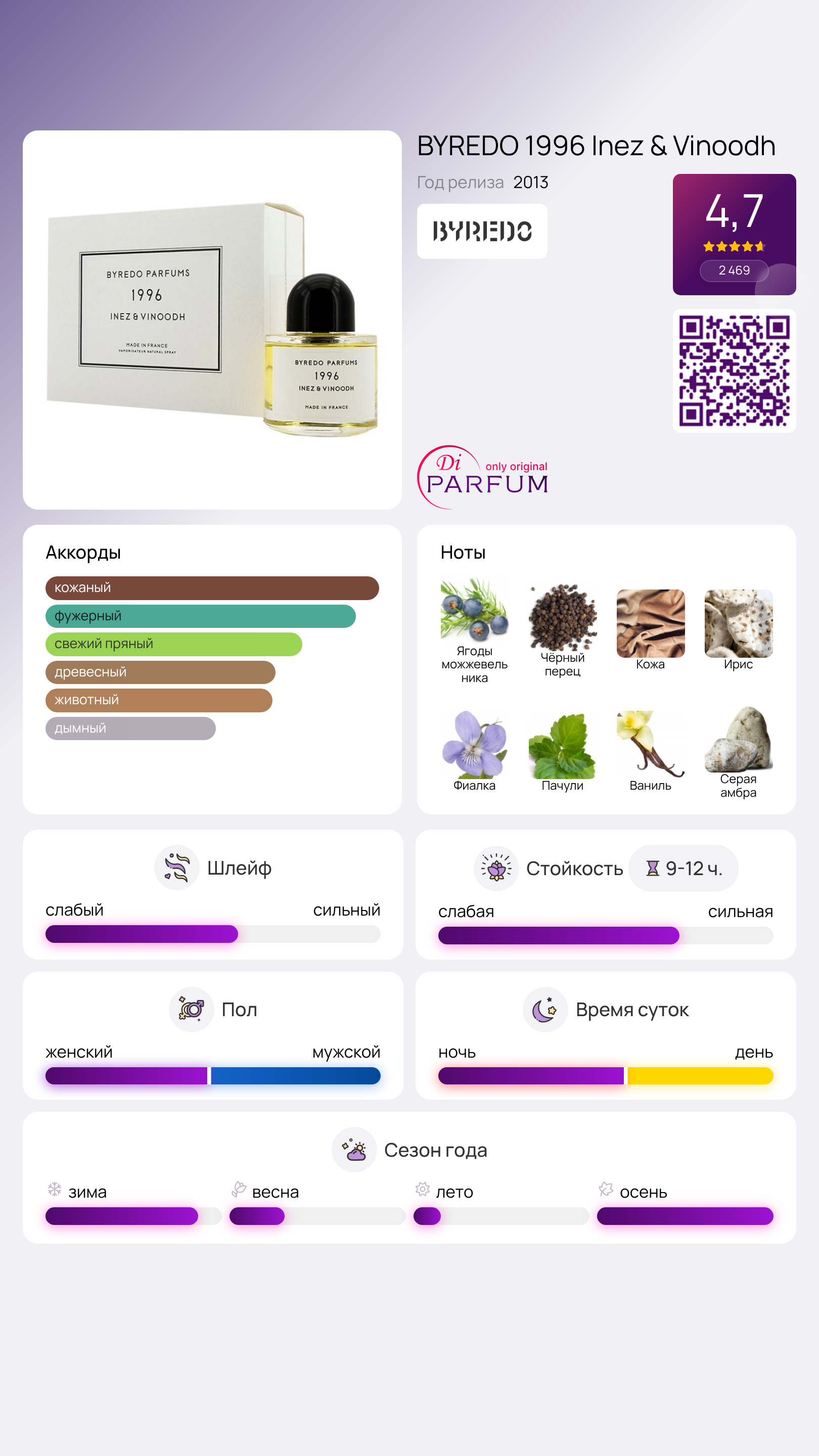 Основные ноты, включающие кожу, янтарь, восточное пачули и корень фиалки, создают атмосферу настоящего праздника. Этот изысканный и яркий аромат идеально подчеркивает уникальность творческой натуры.