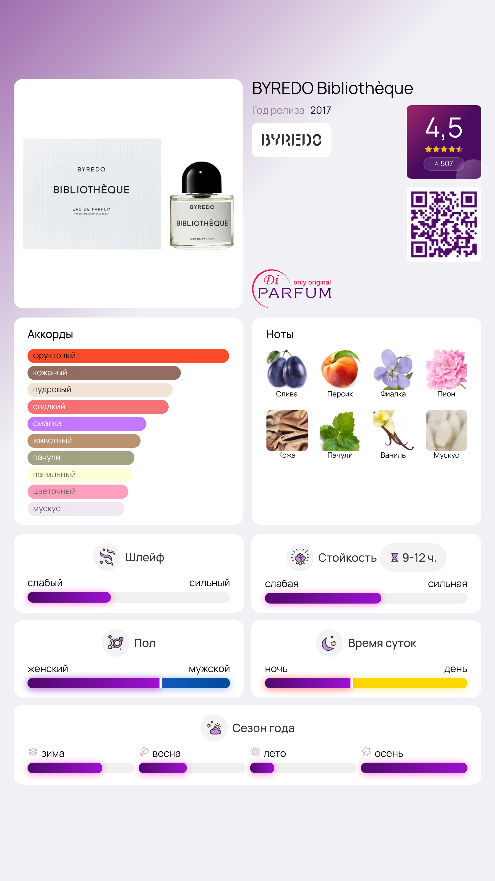 Ароматы – это не просто смеси запахов, а настоящие эмоциональные послания. Каждый парфюм имеет свою уникальную символику, создает определенное настроение и способен влиять на восприятие человека окружающими. Бренд Byredo, продолжая тему своей свечи Bibliothèque, в 2017 году представил унисекс-аромат с тем же названием. Создатели считают, что лучшие аспекты атмосферы библиотеки, вдохновения и умиротворения воплощаются в начальных нотах персика и сливы, переходящих в сердечные аккорды пиона и фиалки, а завершают композицию ноты кожаных переплетов, пачули, мускуса и сладкой ванили.