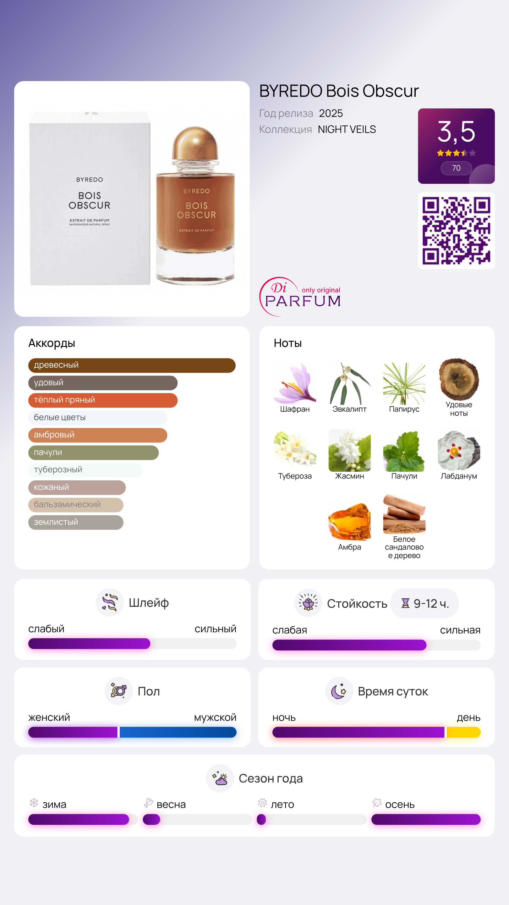 Погрузитесь в мир Bois Obscur и ощутите на себе всю прелесть восточных, цветочных и древесных нот, которые делают этот парфюм настоящим произведением искусства.