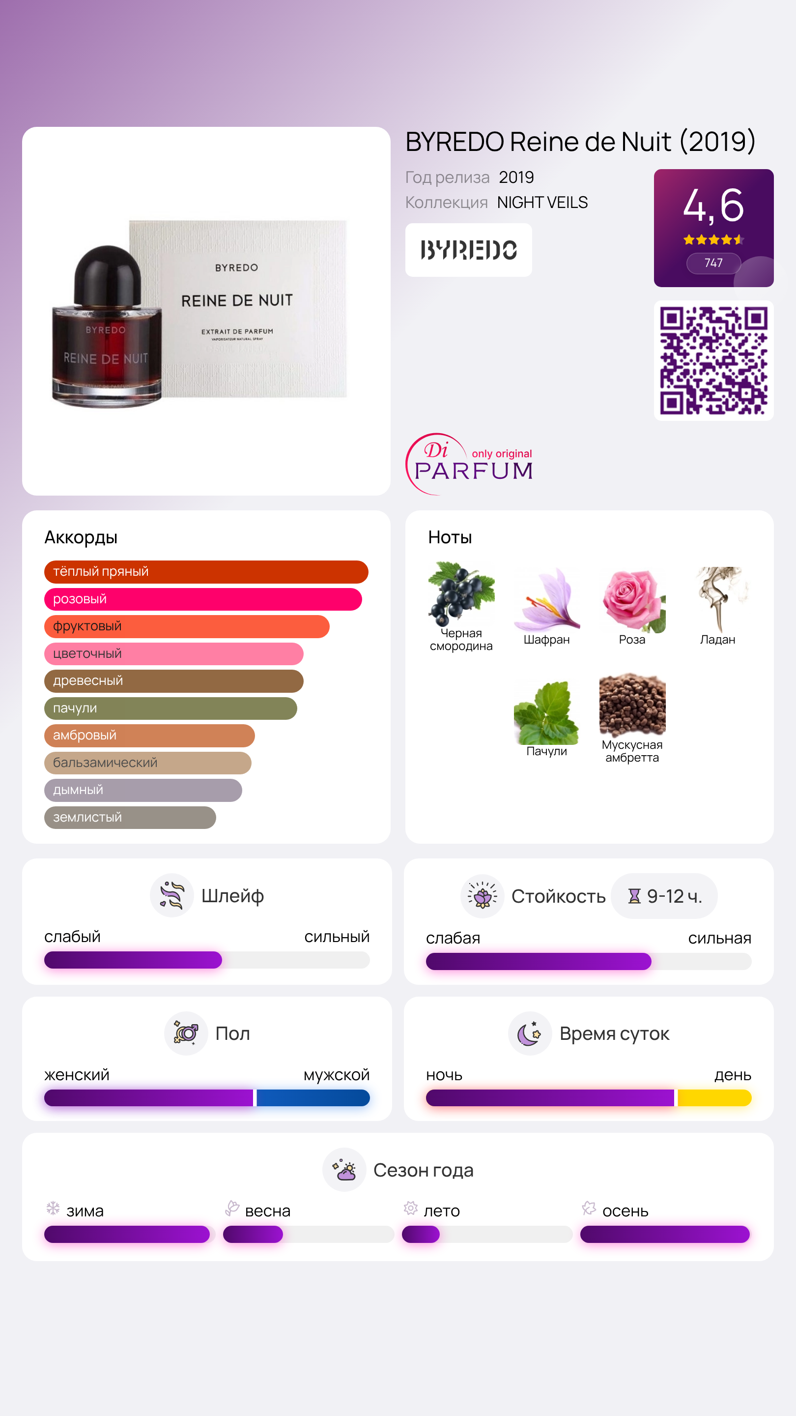 Эликсир BYREDO Reine de Nuit (2019) представляет собой волшебное сочетание шипровых и цветочных ароматов, передающих пьянящее благоухание вечерних цветов. Это композиция, в которой переплетены верные традиции восточной парфюмерии и завораживающий аромат розы. Вместо простого моноаромата, мы имеем дело с кружевной вуалью, искусно созданной из множества аккордов. На ум приходит ассоциация с полночью.
