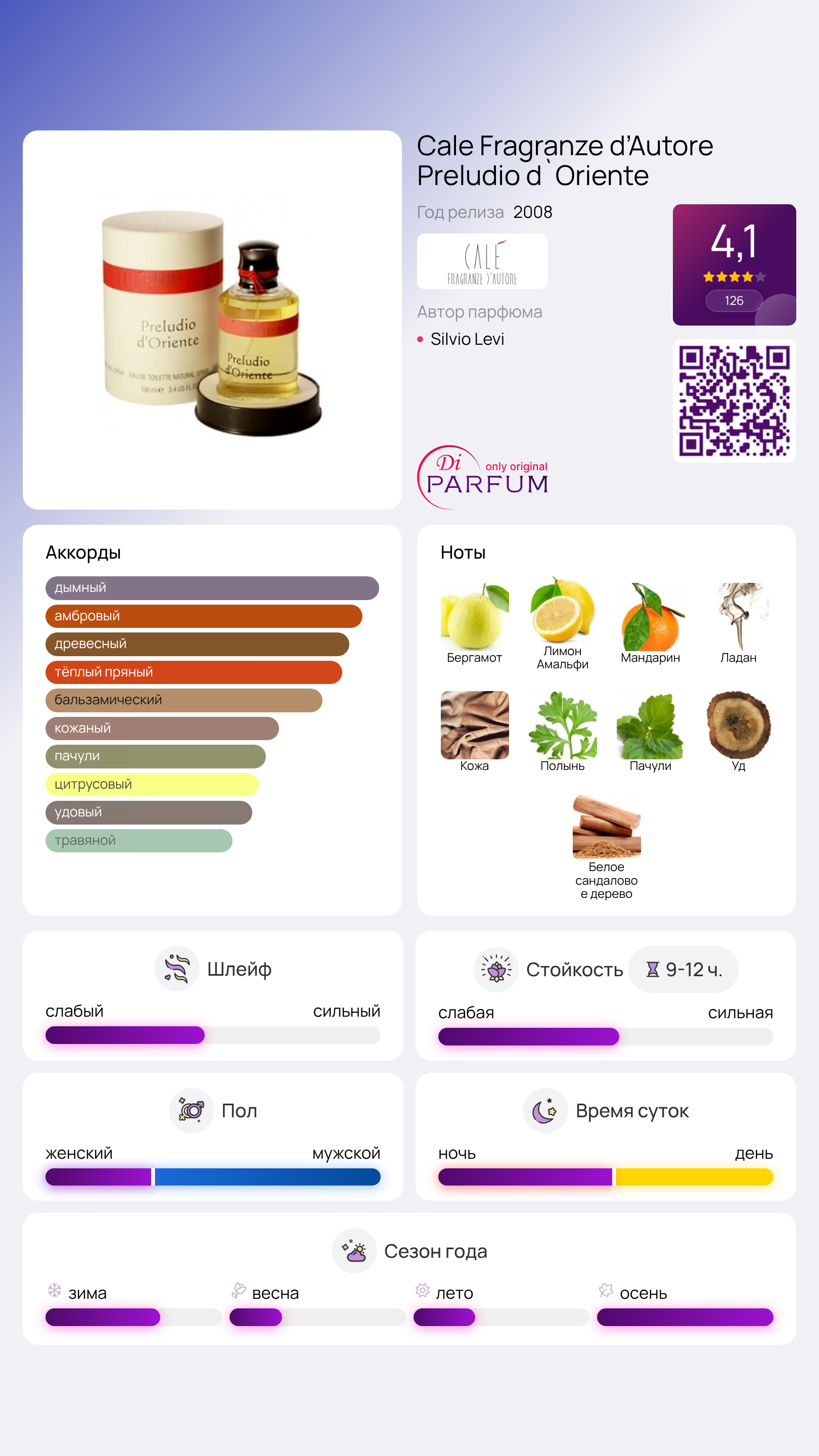 Preludio d'Oriente от Cale Fragranze d’Autore — это восточно-фужерный аромат, подходящий как для женщин, так и для мужчин. Запущенный в 2008 году, этот аромат стал творением парфюмера Сильвио Леви. В верхних нотах звучат бергамот, лимон Амальфи и мандарин, что придает началу свежесть и бодрость. В сердце композиции раскрываются ладан, кожа и артемизия, внося загадочность и глубину. Ноты базы — пачули, сандаловое дерево и уд — создают теплую и насыщенную основу.