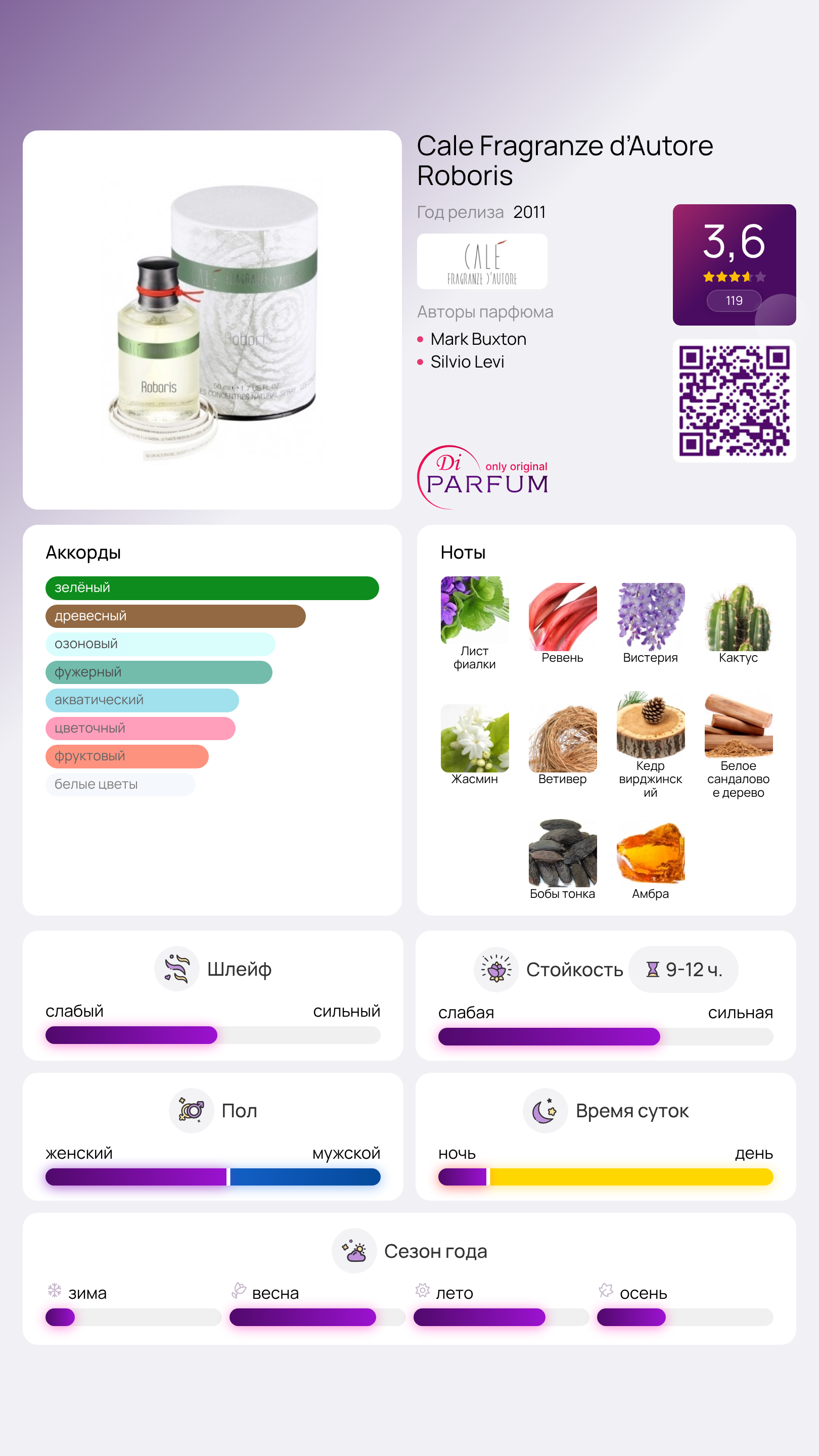 Верхние ноты Roboris раскрываются свежими акцентами фиолетовых листьев, зеленого ревеня и вистерии, создавая яркое и привлекательное первое впечатление. Сердце аромата пульсирует соцветиями кактуса и жасмина, придавая композиции необычную и роскошную глубину. Завершают этот волшебный букет базовые ноты ветивера, вирджинского кедра, сандалового дерева, бобов тонка и теплой амбры, которые дарят аромату стойкость и элегантность.