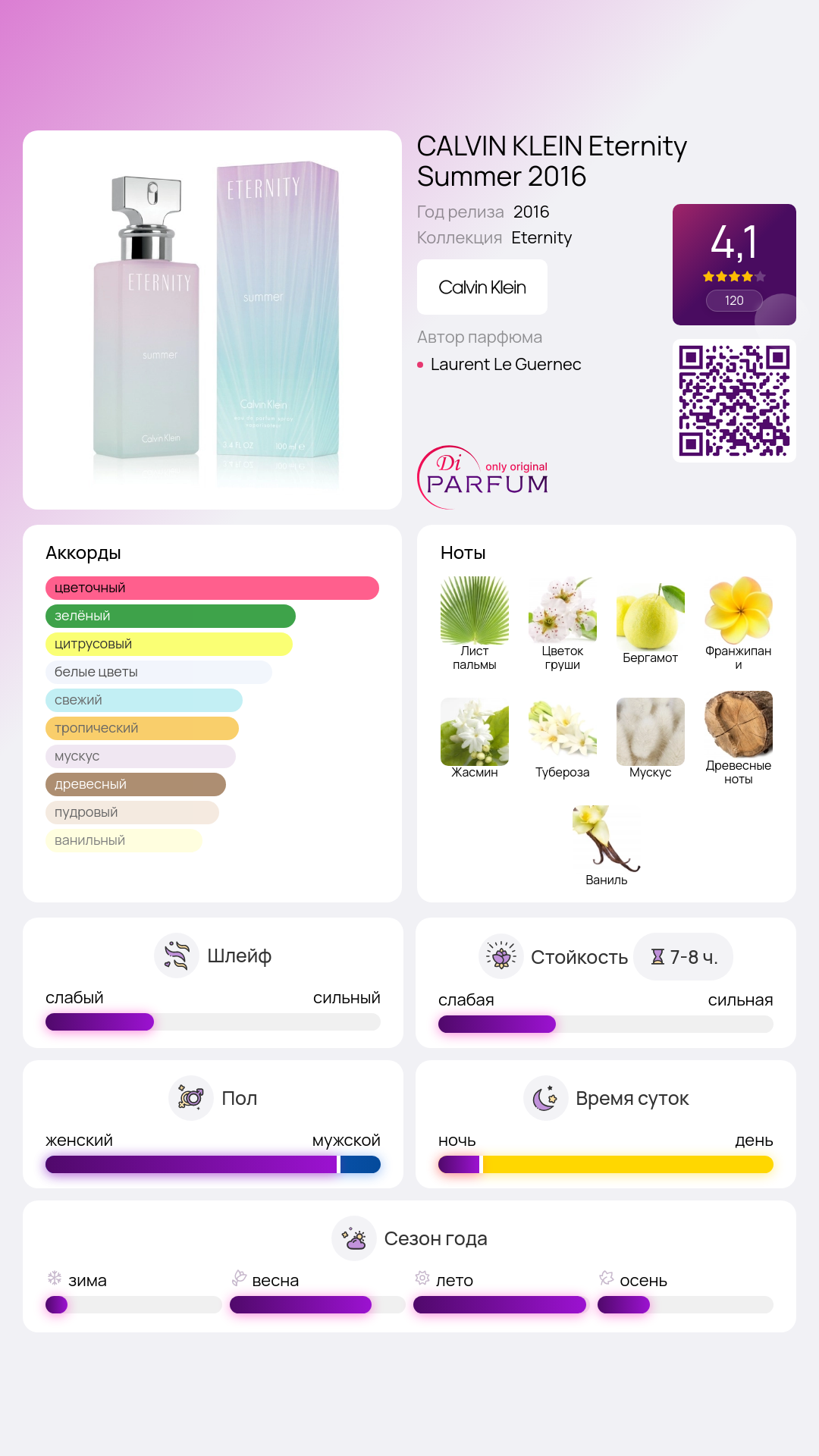 Eternity Summer 2016 от Calvin Klein — это цветочный аромат для женщин, который был представлен в 2016 году. За создание этого великолепного парфюма отвечает парфюмер Laurent Le Guernec. В верхних нотах сочетаются листья пальмы, цветы груши и бергамот; в сердце аромата раскрываются ноты франжипани, жасмина и туберозы; базу составляют мускус, светлая древесина и ваниль.