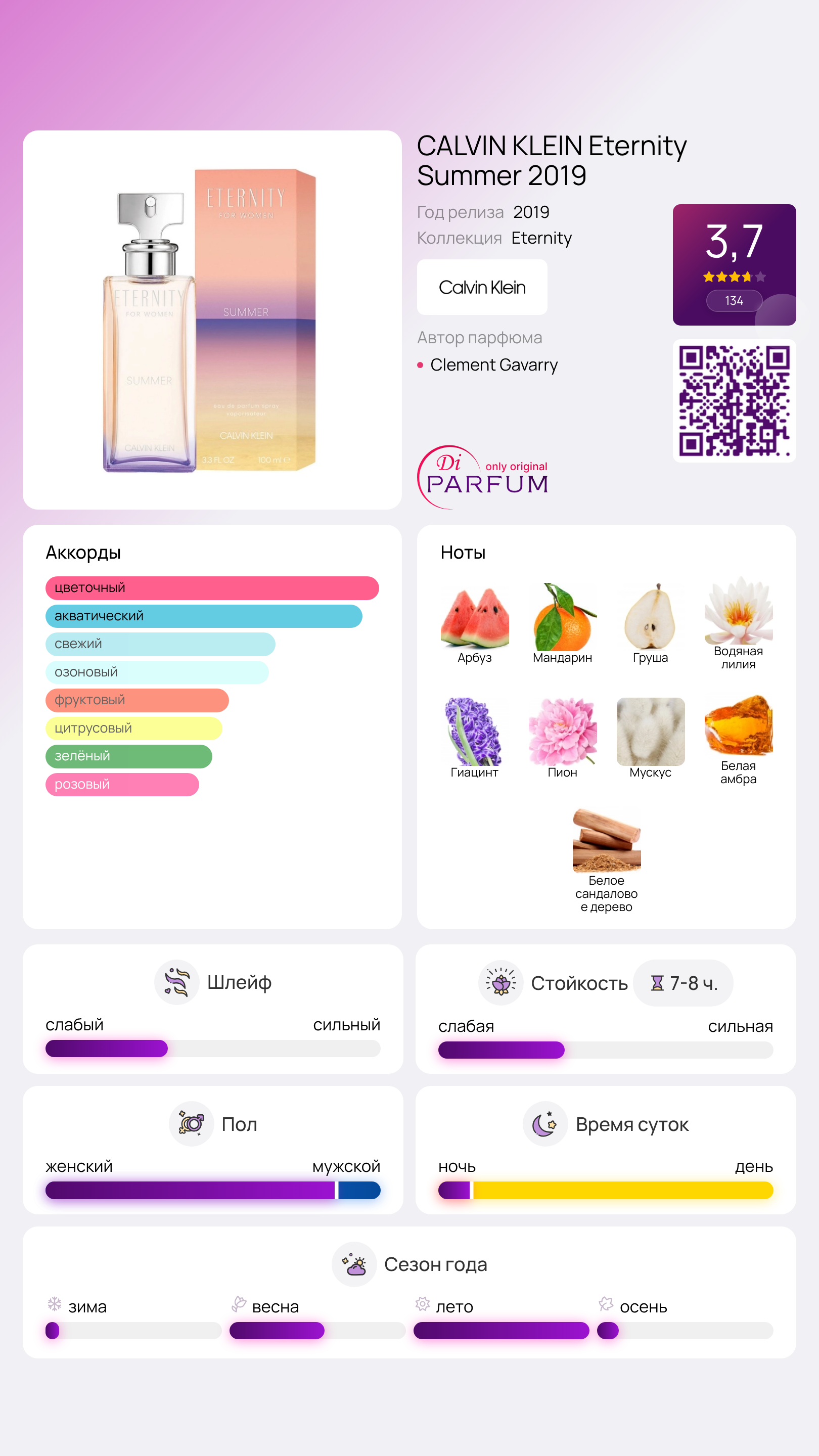 Eternity Summer 2019 идеально подходит для носки в теплые дни, будь то солнечные прогулки по городу или романтические встречи. Этот аромат подарит вам ощущение легкости и свежести, перенесет в мир лета и уюта. Порадуйте себя или близкого человека этой восхитительной композицией!