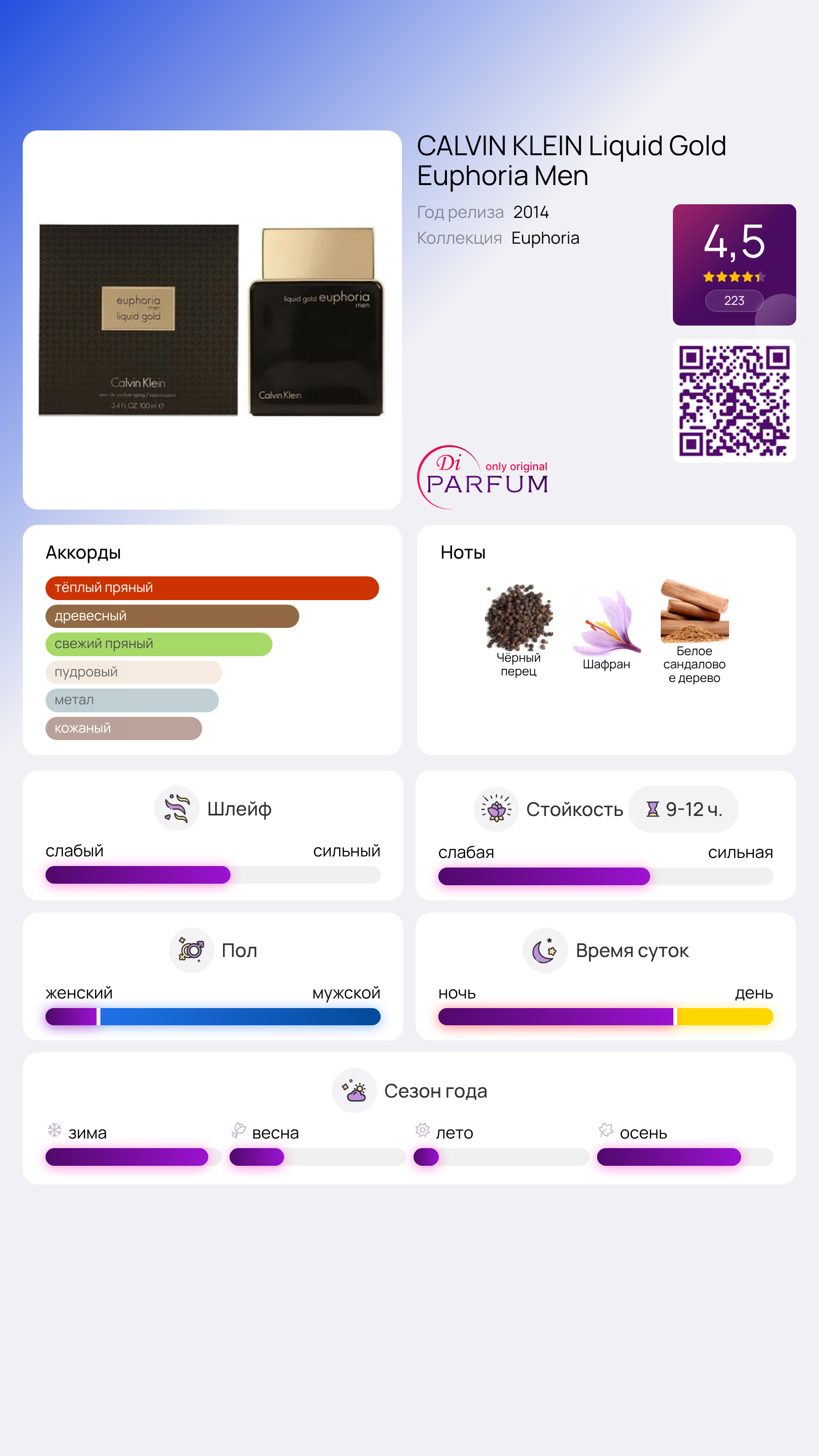 Liquid Gold Euphoria Men от Calvin Klein — это восточно-древесный аромат для мужчин, выпущенный в 2014 году. В его композиции стартовая нота черного перца дарит свежесть с первых секунд, переходя к насыщенному сердцу из шафрана и завершаясь мягким, кремовым сандалом в базе.