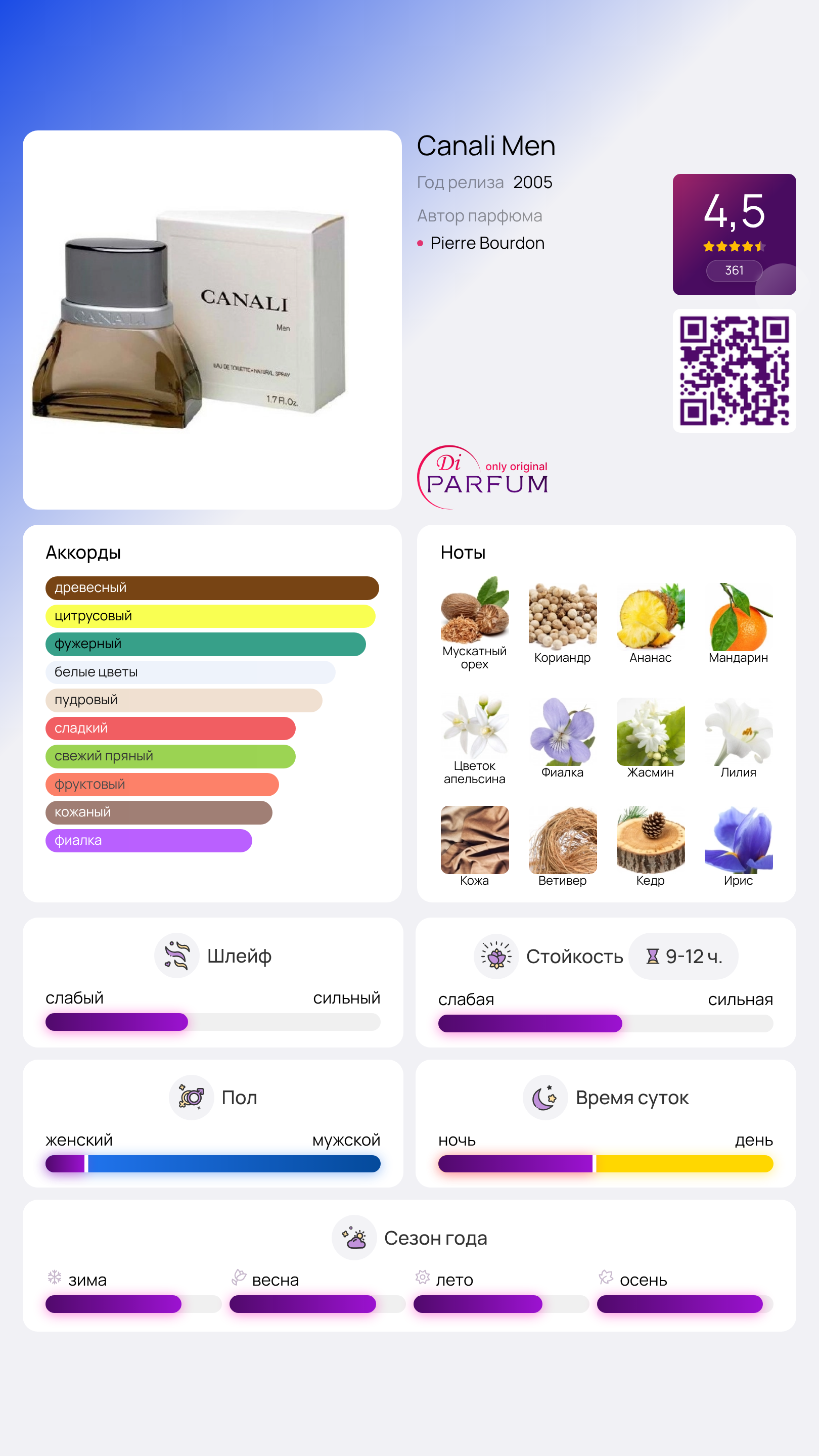 Ароматная композиция построена на трёх основных аккордах. Первые ноты раскрываются свежими цитрусовыми: ананасом, бергамотом, яблоком, апельсином и мандарином, а также пряным кориандром, кардамоном и мускатным орехом. Сердце аромата составляют цветочные акценты, среди которых жасмин, фиалка, полевые лилии и цветы апельсина. В завершении, основа композиции включает в себя ноты ветивера, ириса, мускуса, кедра, сандала, кожи, тонки и древесины бакаута.