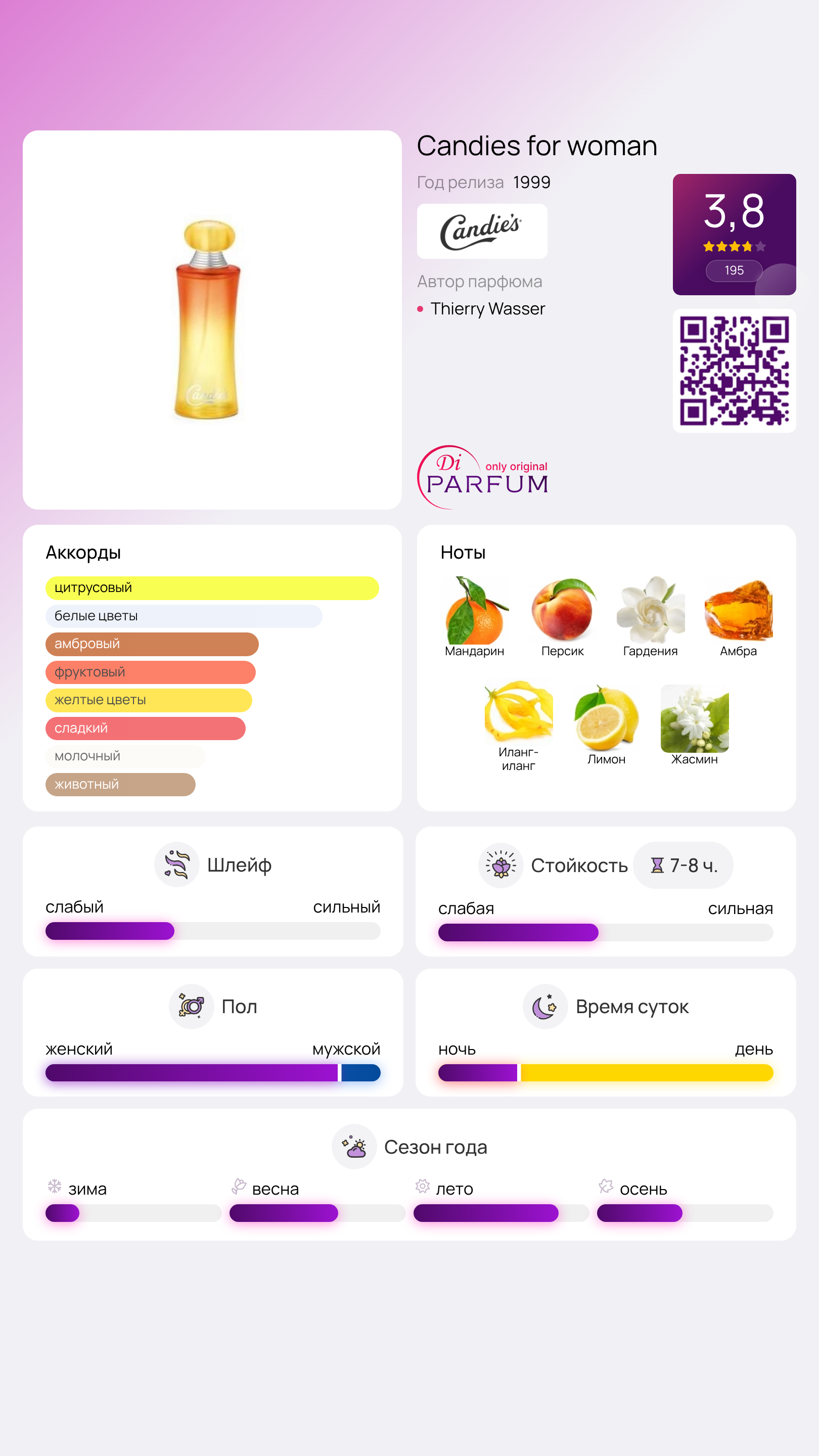 В его главных нотах можно выделить лимон, мандарин, апельсин, гардению, жасмин, иланг-иланг и персик.