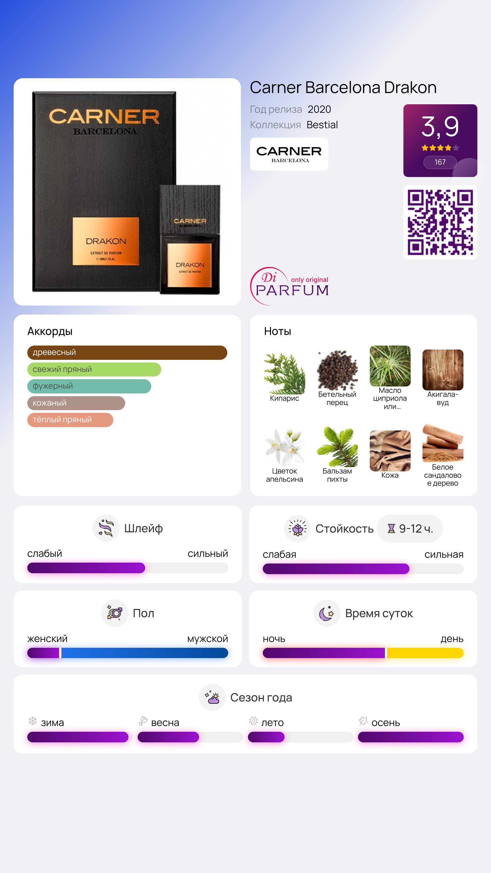 Докосновенный и чарующий аромат Drakon — это выдающееся произведение испанского нишевого бренда Carner Barcelona, который завоевал сердца ценителей парфюмерии по всему миру своими уникальными и смелыми композициями. Этот восточно-древесный аромат запоминается благодаря своему мощному и страстному началу, чувственному центру и насыщенному, стойкому послевкусию.