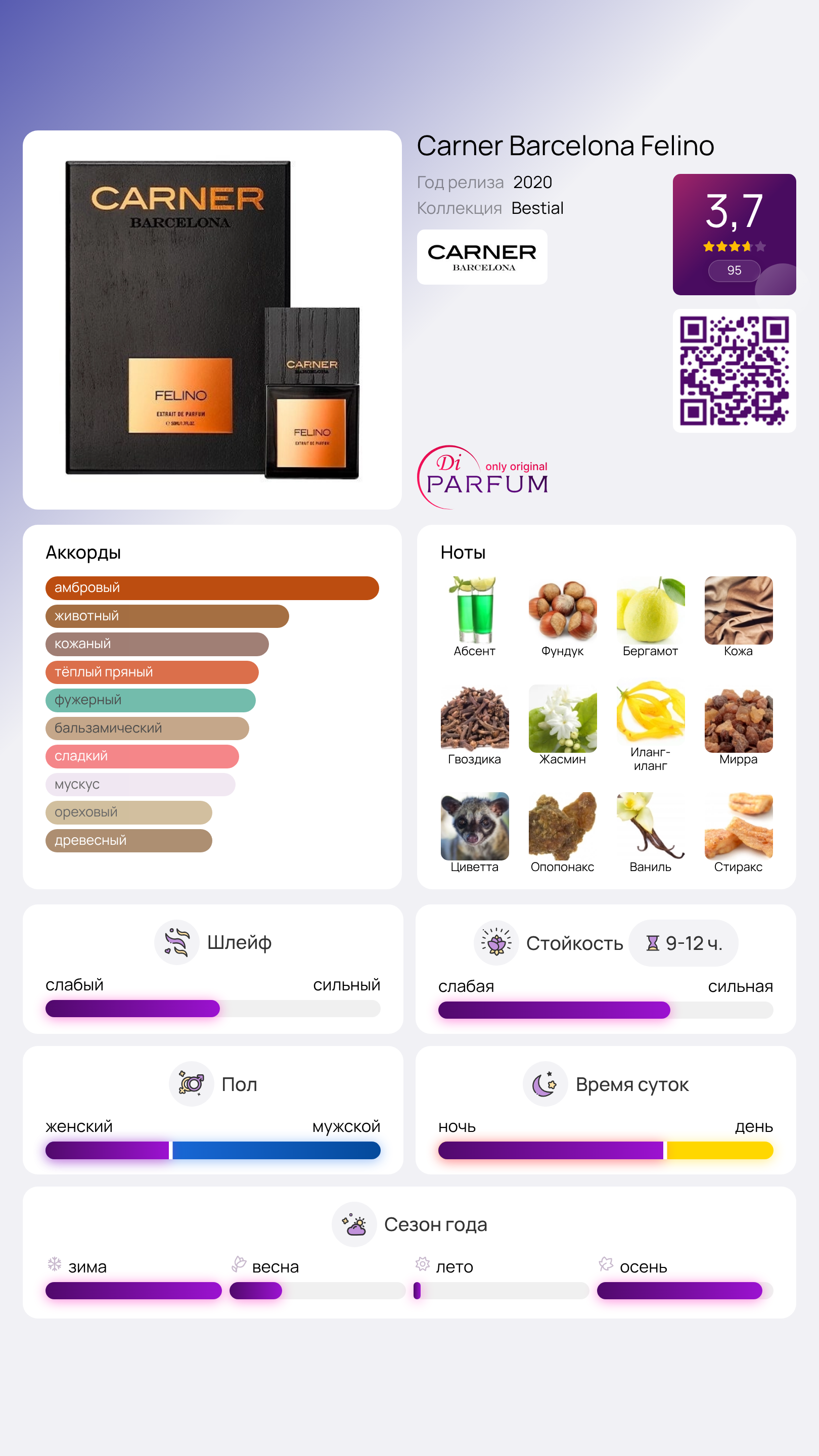 Мастера испанского нишевого парфюмерного бренда Carner Barcelona снискали уважение среди знатоков парфюмерного искусства благодаря способности создавать уникальные, выразительные и структурированные ароматы, используя неожиданные и неординарные ингредиенты, сочетая их с удивительной гармонией. Один из таких примеров – захватывающий парфюм под названием Felino, который был добавлен в ассортимент бренда в 2020 году.