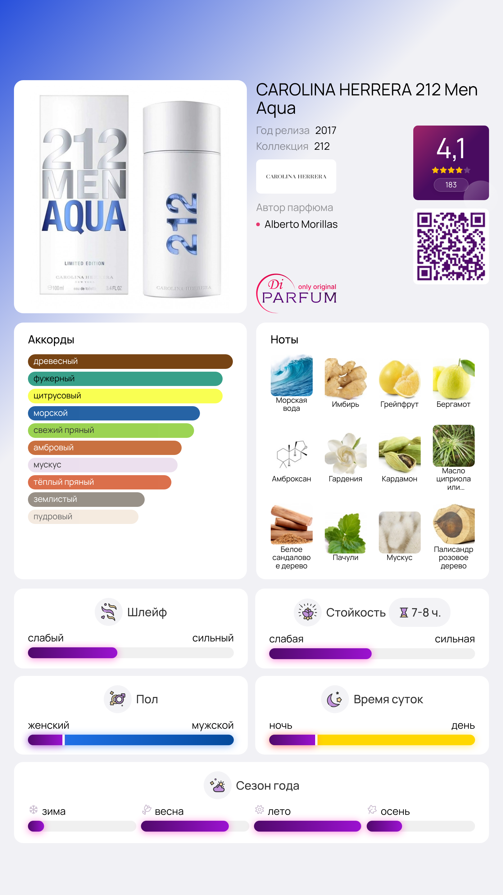 Начальные ноты аромата наполняют чувство легкости и чистоты благодаря свежести морской воды. Пряный имбирь, бодрящий грейпфрут и освежающий бергамот придают композиции яркость и живость. В сердце раскрывается теплая глубина молекулы Ambroxan, которая сочетает в себе цветочные ноты гардении. Кардамон и нагармота добавляют многослойности и утонченного звучания.
