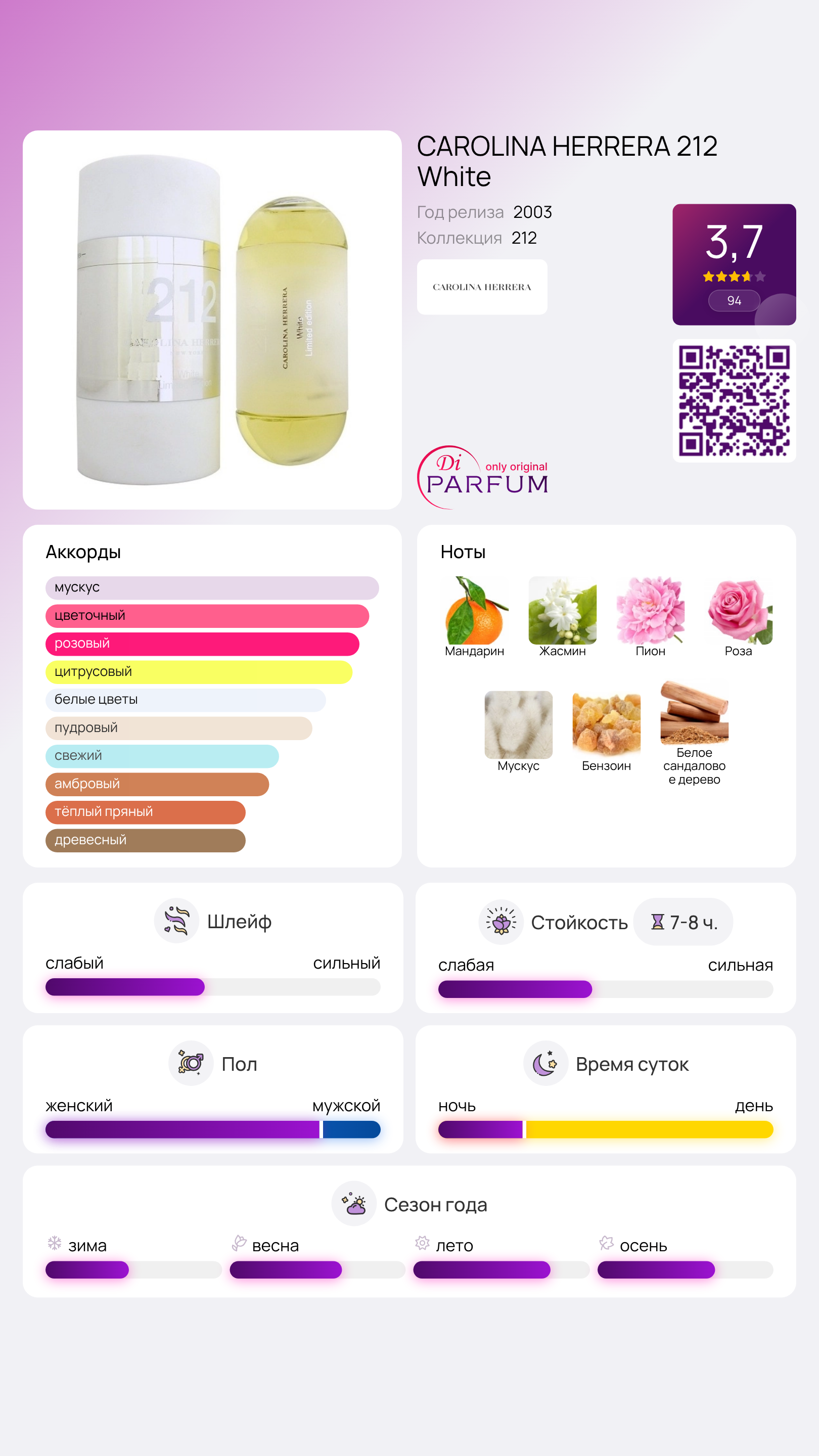 Аромат 212 White от Carolina Herrera, который обожают женщины, получил свое название не случайно: оно связано как с цветом упаковки, так и с зимним временем, когда он был представлен – всё вокруг утопает в белом снегу. Концепция этого аромата отражает морозный воздух, искрящиеся на солнце снежинки и атмосферу радости, предвещающую праздники.