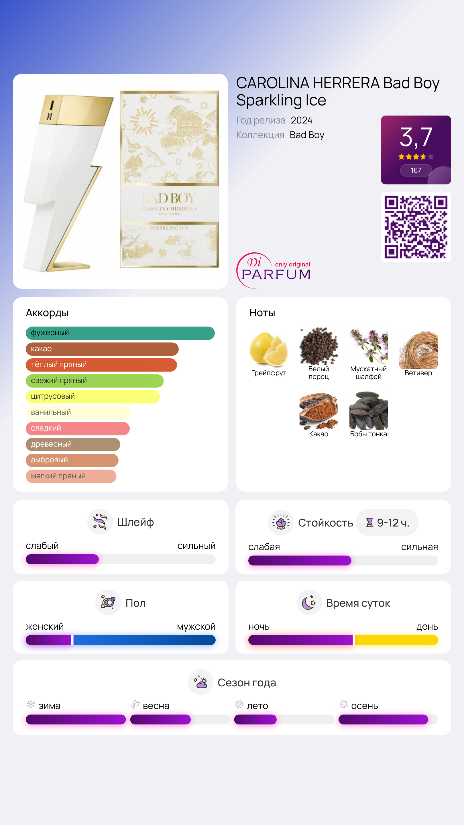 Bad Boy Sparkling Ice от Carolina Herrera — это древесный аромат для мужчин, который был представлен в 2024 году в рамках ограниченной серии. Этот новый парфюм сочетает в себе светлые и темные элементы, создавая уникальное и энергизирующее обонятельное наслаждение.