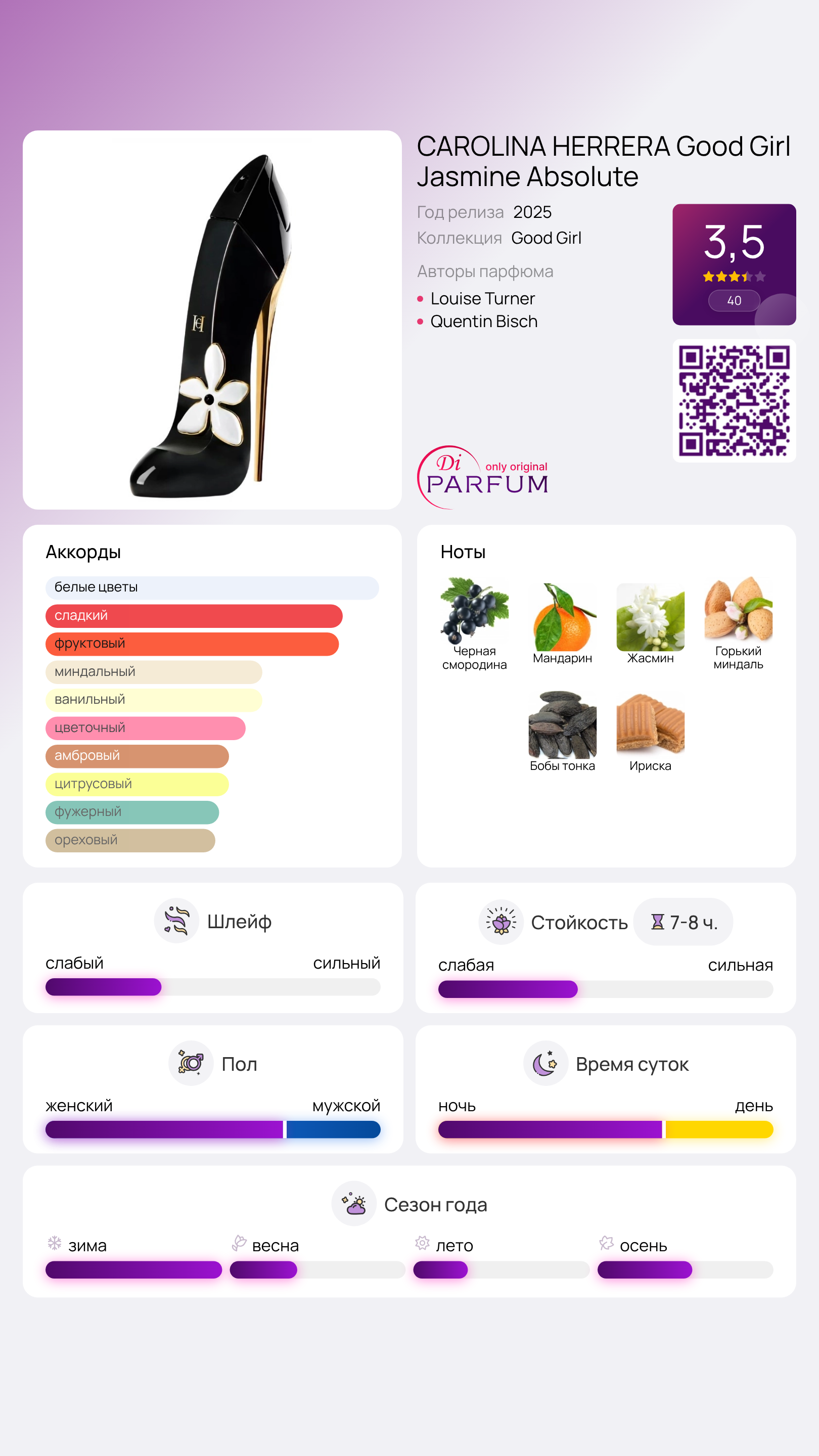 Верхние ноты аромата раскрываются яркими аккордами черной смородины и мандарина, создавая освежающее первое впечатление. В сердце звучит соблазнительный жасмин, обрамленный горьким миндалем, который добавляет аромату утончённости и глубины. Завершает композицию насыщенный шлейф из бобов тонка и сладкого тоффи, придающий аромату сладкую нотку и уникальность.