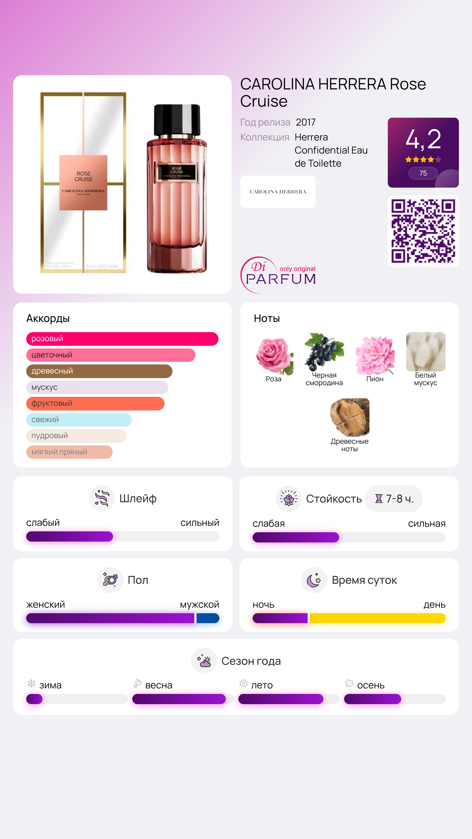 Разве могли парфюмеры Carolina Herrera не уделить должное внимание королеве цветов — розе, создавая свою изысканную коллекцию Herrera Confidential? Именно так называется аромат Rose Cruise, который был выпущен в 2017 году и предназначен как для мужчин, так и для женщин.