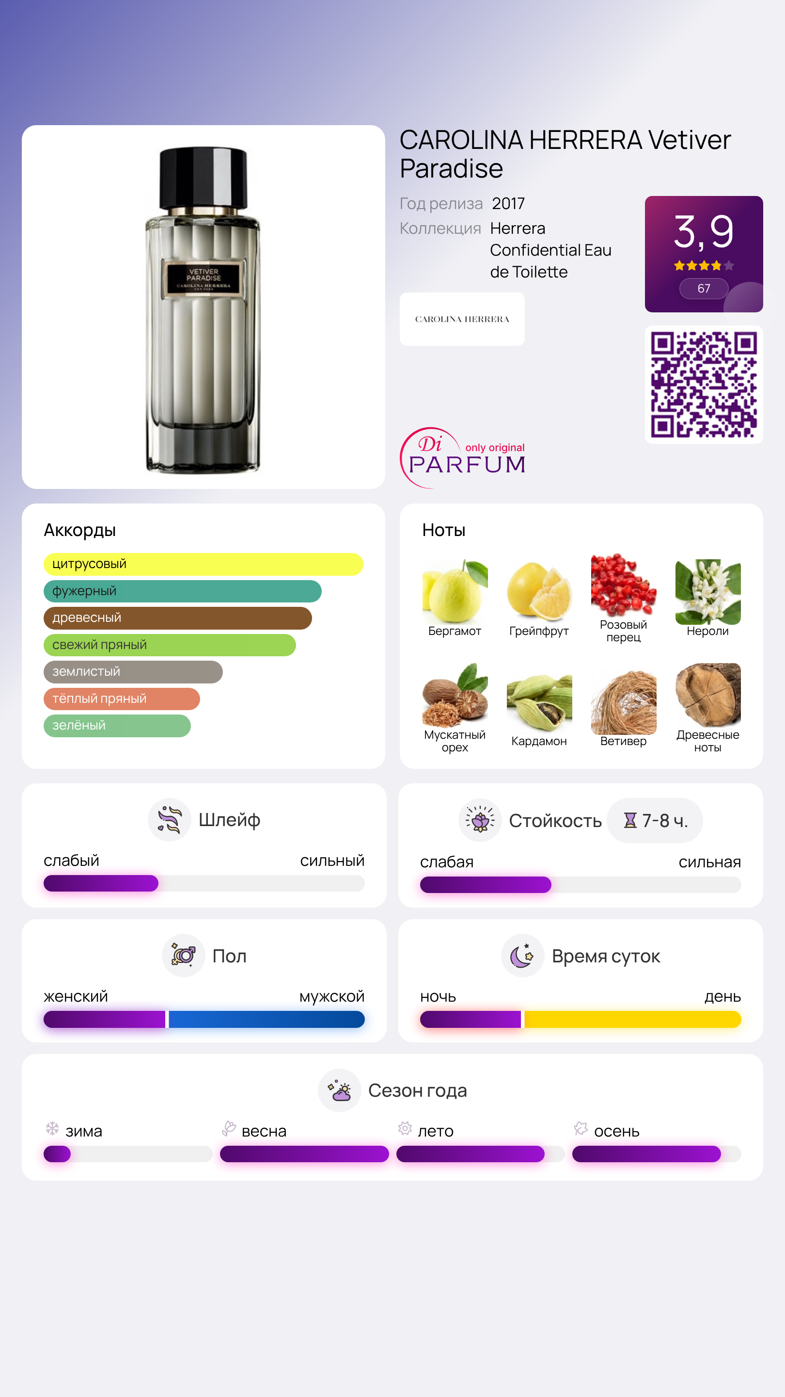 Парфюм Vetiver Paradise, относящийся к древесно-пряной категории и разработанный для мужчин и женщин, был представлен брендом в 2017 году как часть коллекции Herrera Confidential. В этом удивительном аромате главенствующую роль играет ветивер, который становится основой всей композиции с его земляными нотами, подчеркнутыми сухими травами и древесными акцентами.