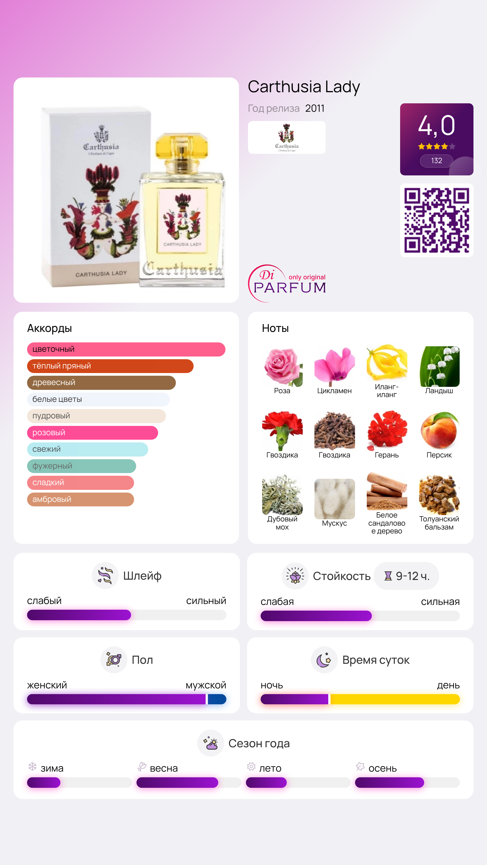 В 2011 году нишевый бренд Carthusia порадовал женщин уникальным ароматом цветочного шипра под названием Carthusia Lady. Этот парфюм пронизан некой волшебной атмосферой, возвращающей к временам, когда слово "Леди" ассоциировалось с божественной сущностью, а грация и стиль считались неотъемлемыми качествами. Эти века были наполнены роскошью и аристократическим шиком.