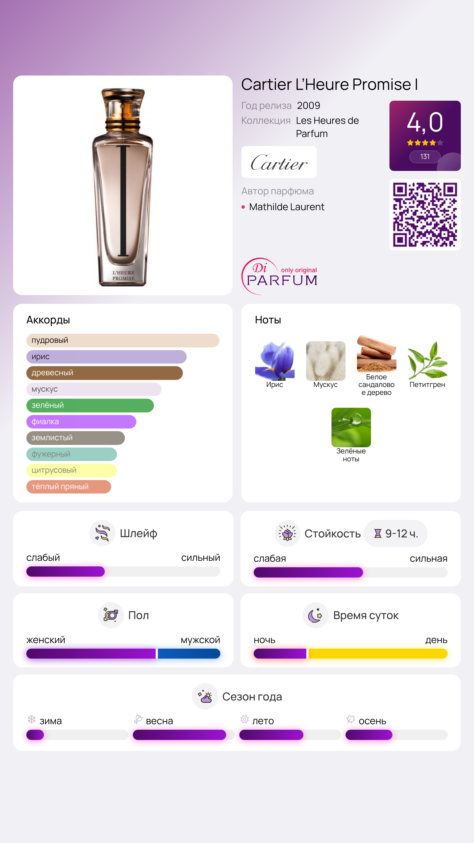 Les Heures de Cartier: L'Heure Promise I от Cartier — это цветочно-зеленый аромат, созданный как для женщин, так и для мужчин. Выпущенный в 2009 году, этот парфюм стал результатом творчества парфюмера Матьильды Лоран.