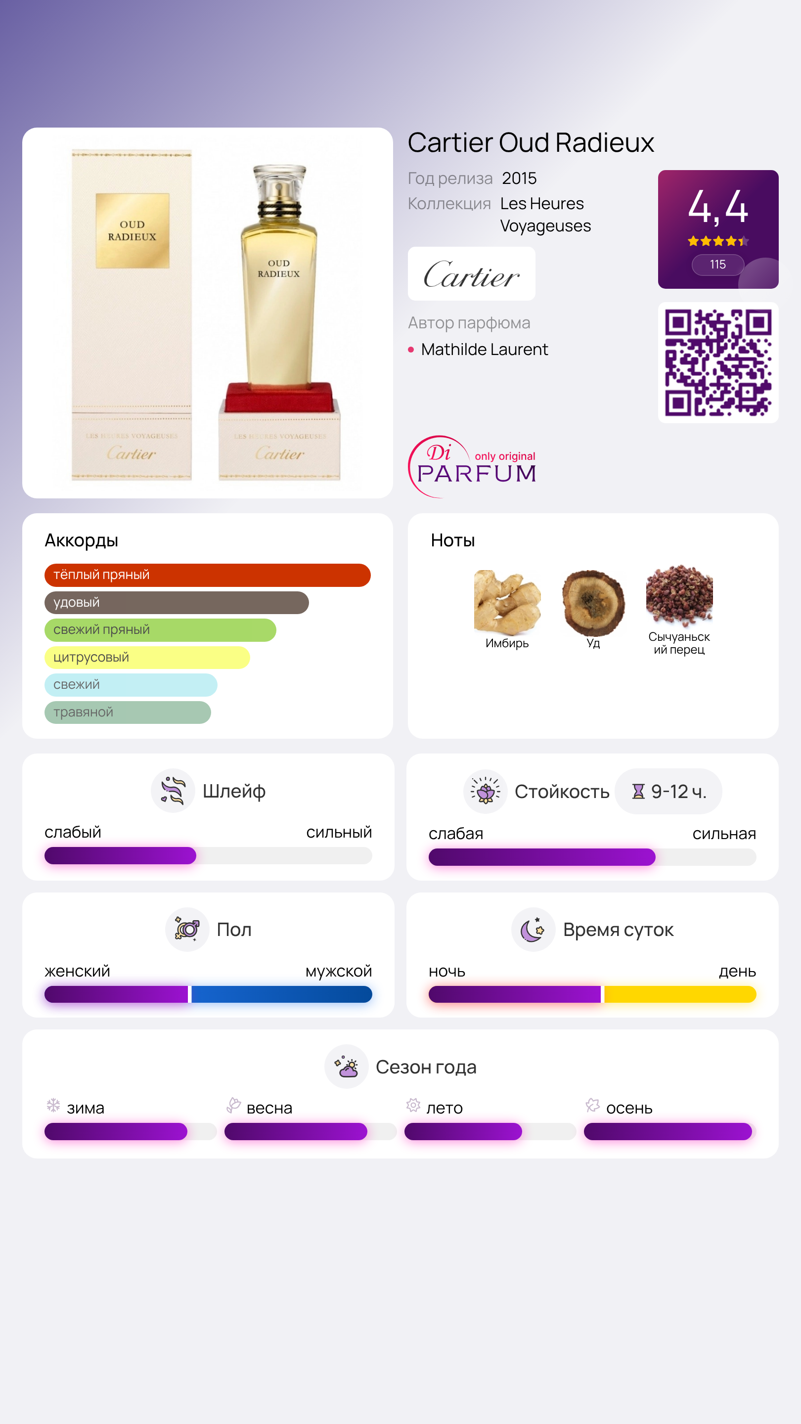 Несмотря на простую структуру, аромат Oud Radieux пленяет своей романтичной атмосферой, восточным обаянием и загадочностью. Верхние ноты представлены элегантными и острыми аккордами китайского перца, которые придают аромату пикантность. Сердце композиции наполнено чарующим удом, который добавляет соблазнительные нюансы. Завершают аромат бархатисто-пряные нотки имбиря, создавая незабываемый финал.