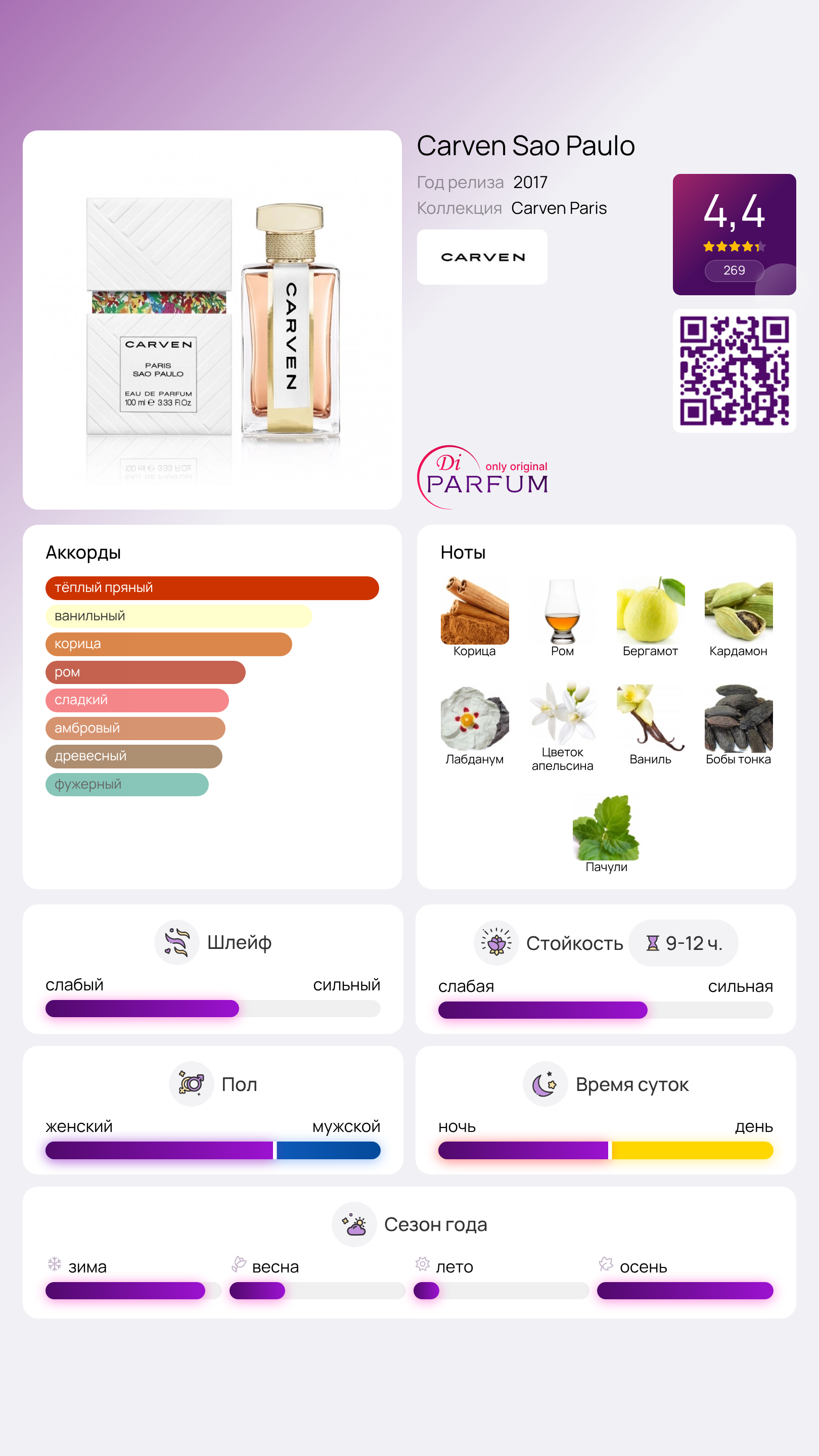 Paris Sao Paulo станет отличным выбором для вечерних мероприятий и особых случаев, когда вы хотите произвести впечатление. Этот аромат подчеркивает индивидуальность и уверенность, заставляя сердце биться быстрее от восторга. Привнесите атмосферу бразильского карнавала в свою жизнь с помощи Paris Sao Paulo от Carven.