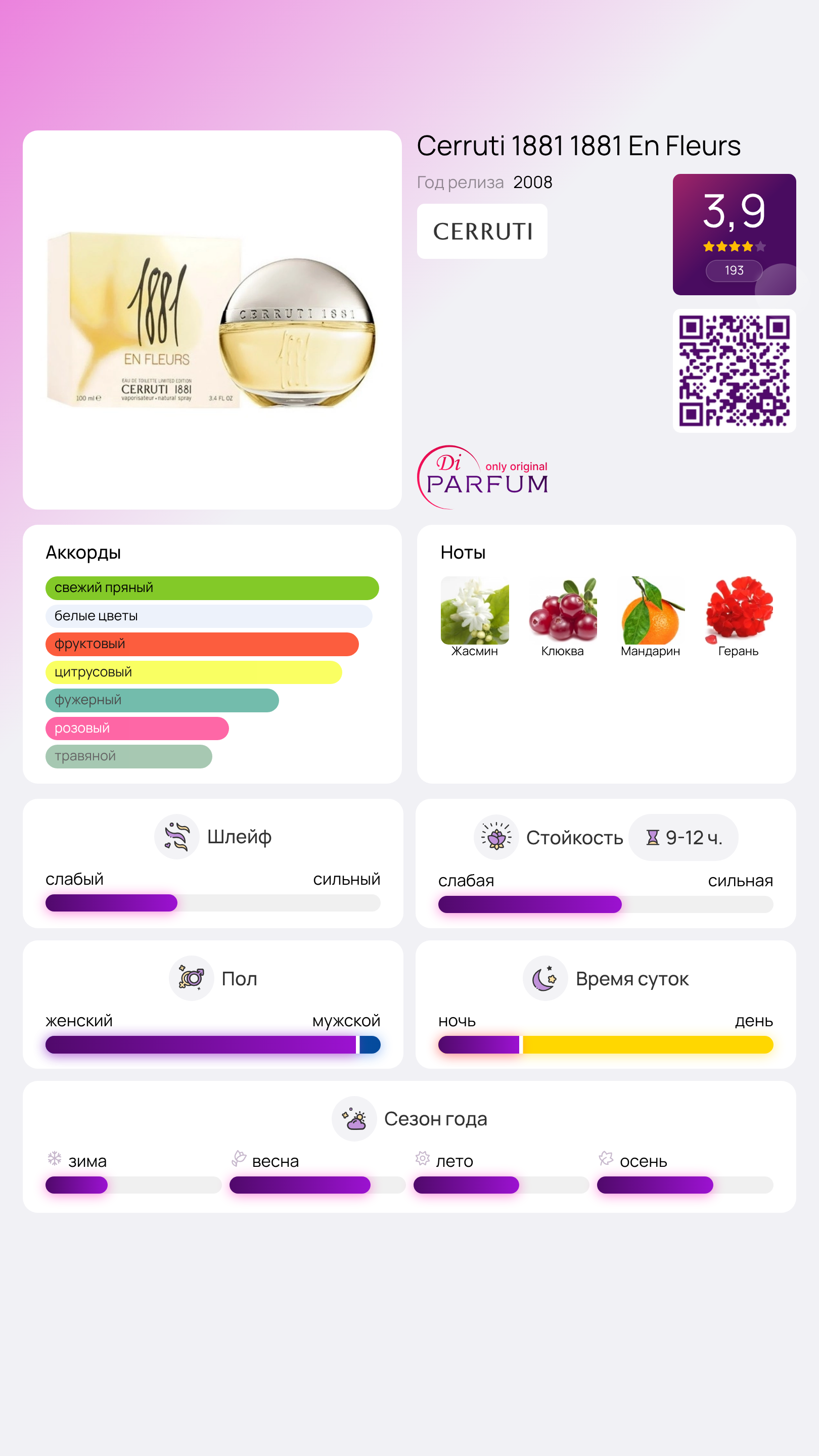 Аромат 1881 En Fleurs от Cerruti, нежный и легкий, олицетворяет самую чарующую пору года – весну. Он излучает свежесть весеннего воздуха, ароматы природы и предвкушение радости и новизны. Этот парфюм великолепно отражает весеннее настроение женщин – игривость и кокетливость, радость и беззаботность. В аромате ощущается естественное весеннее стремление flertовать и привлекать мужское внимание.