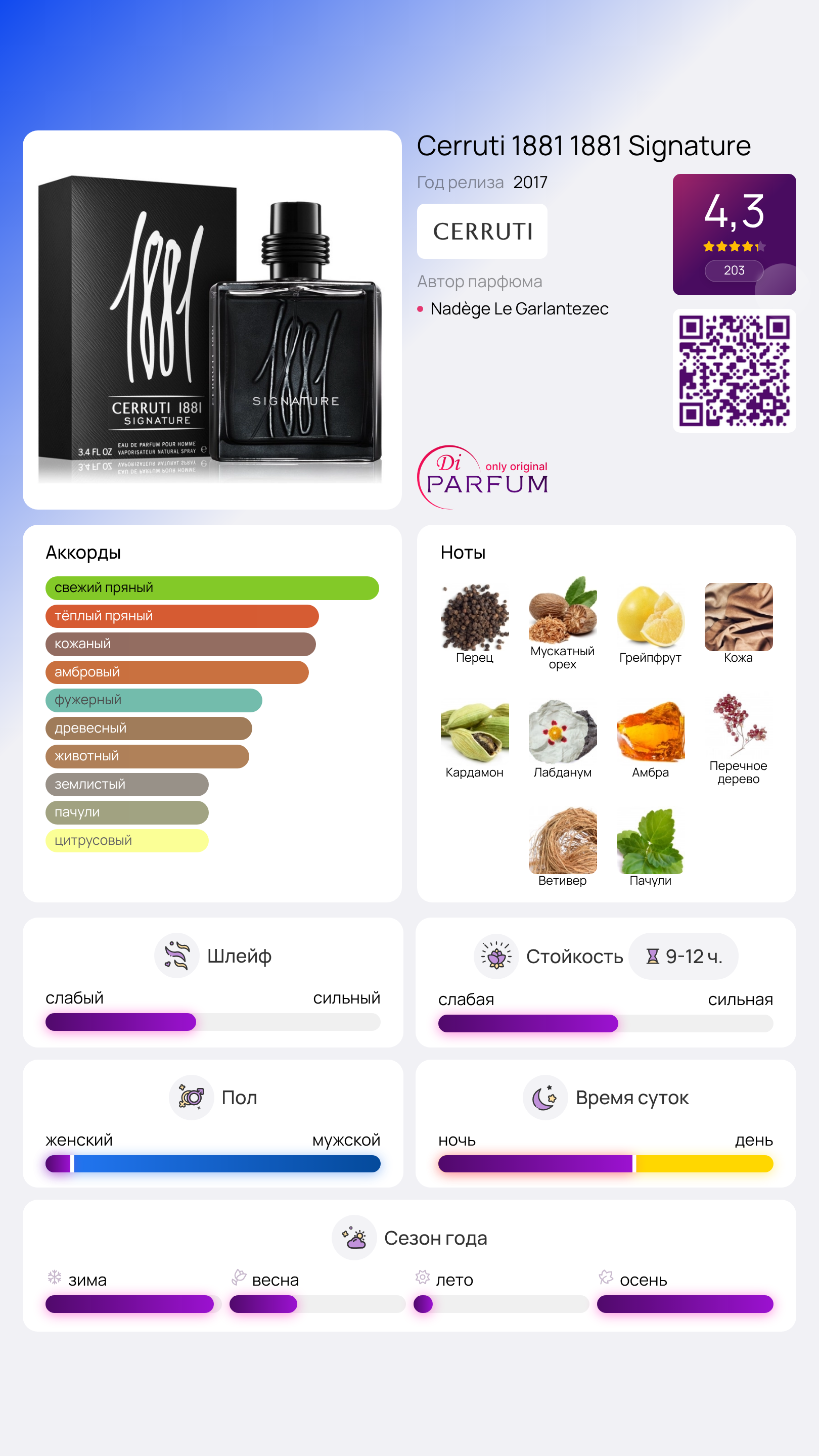 Для поклонников кожаных ароматов с восточными пряными нотами в 2017 году был представлен новый парфюм от знаменитого бренда Cerruti — 1881 Signature. Создателем этой композиции стала парфюмер Нadegе le Garlantezec, которая сумела создать гармоничную пирамиду из сложного набора ингредиентов.