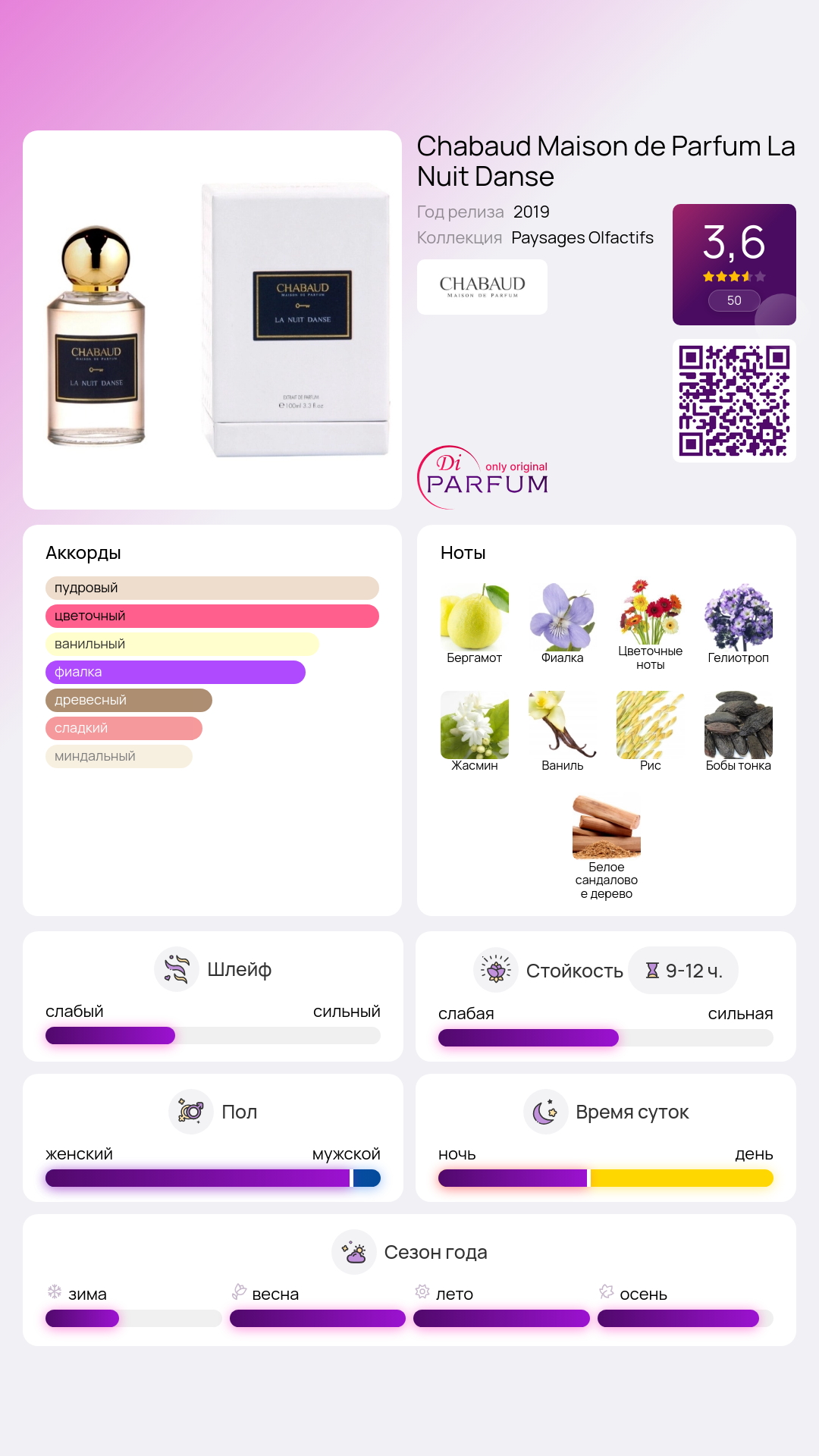 Шлейф, обладающий бархатной текстурой, состоит из молочного риса, элегантного сандалового дерева и ароматных бобов тонка с дымной ванилью, что усиливает соблазнительность букета. Искушающий аромат La Nuit Danse от Chabaud Maison de Parfum — это настоящее волшебство, которое станет великолепным дополнением туалетного столика загадочной и чувственной женщины. Этот парфюм был создан французским брендом в 2019 году.