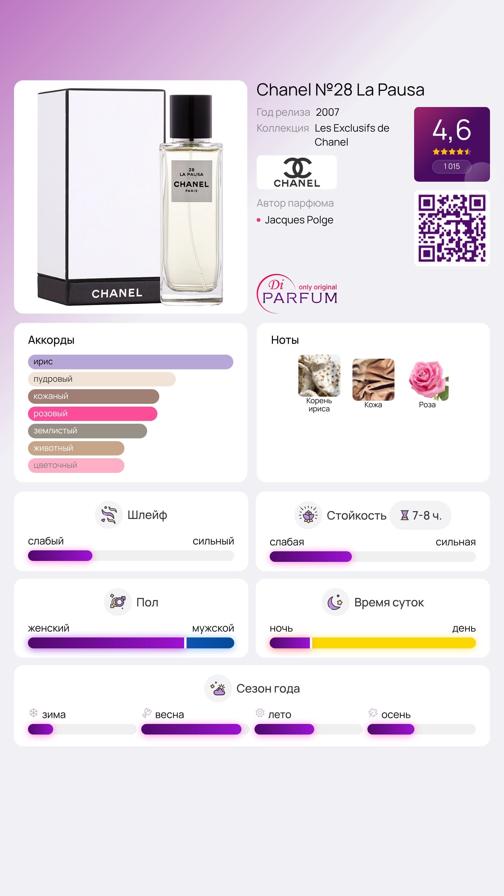 Для того чтобы передать уникальное сочетание роскоши и простоты этого места, Жак Польж раскрыл все нюансы и контрасты аромата ириса. Его композиция представляет собой лёгкое прикосновение сладкого и нежного пудрового облака, соединенного с ароматной розой и согретого тёплой кожей.